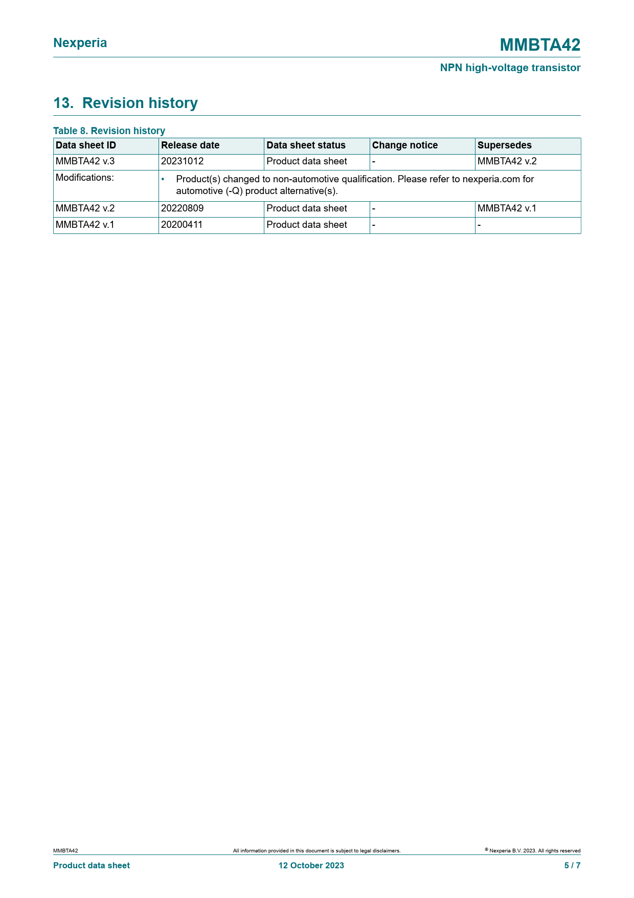 | Pages / Page | 7 / 5 — Nexperia. MMBTA42. NPN high-voltage transistor. 13. Revision history … |