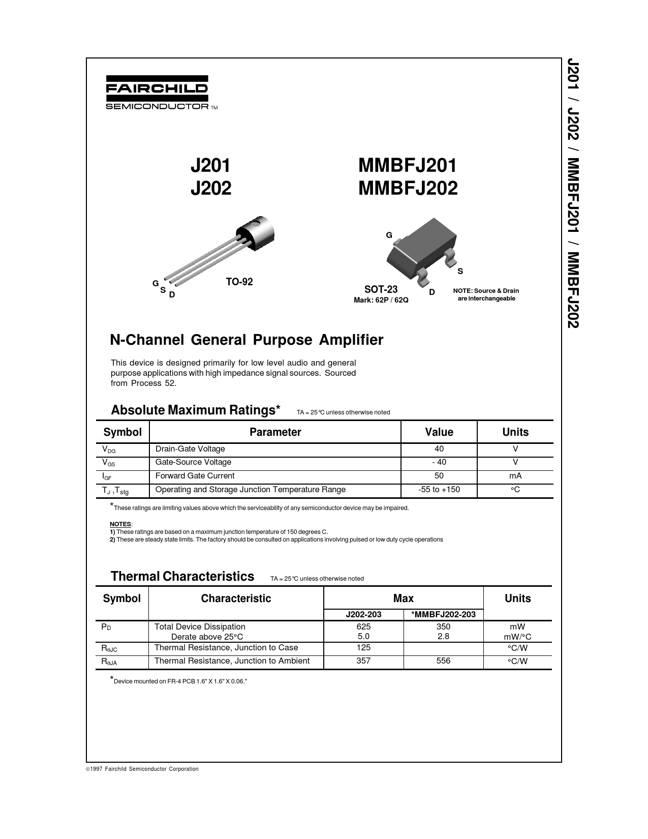 J201 / J202 / MMBFJ201 / MMBFJ202 J201 MMBFJ201 J202 MMBFJ202 G S G TO-92 S SOT-23 D D NOTE: Source & Drain Mark: 62P / 62Q are interchangeable N-Channel General Purpose Amplifier