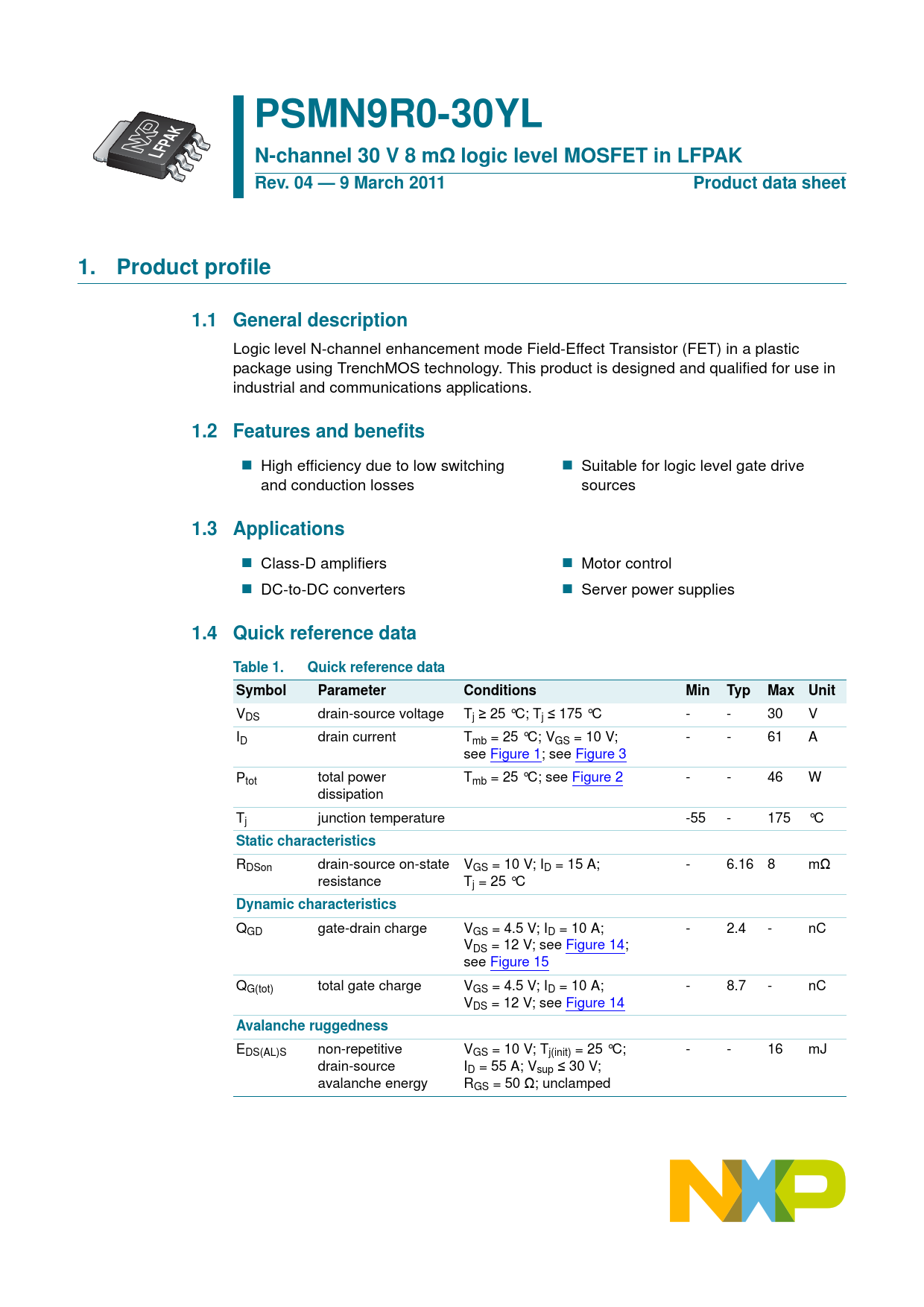 PSMN9R0-30YL. LFP. N-channel 30 V 8 mΩ logic level MOSFET in LFPAK. Rev. 04 — 9 March 2011. Product data sheet. Product profile
