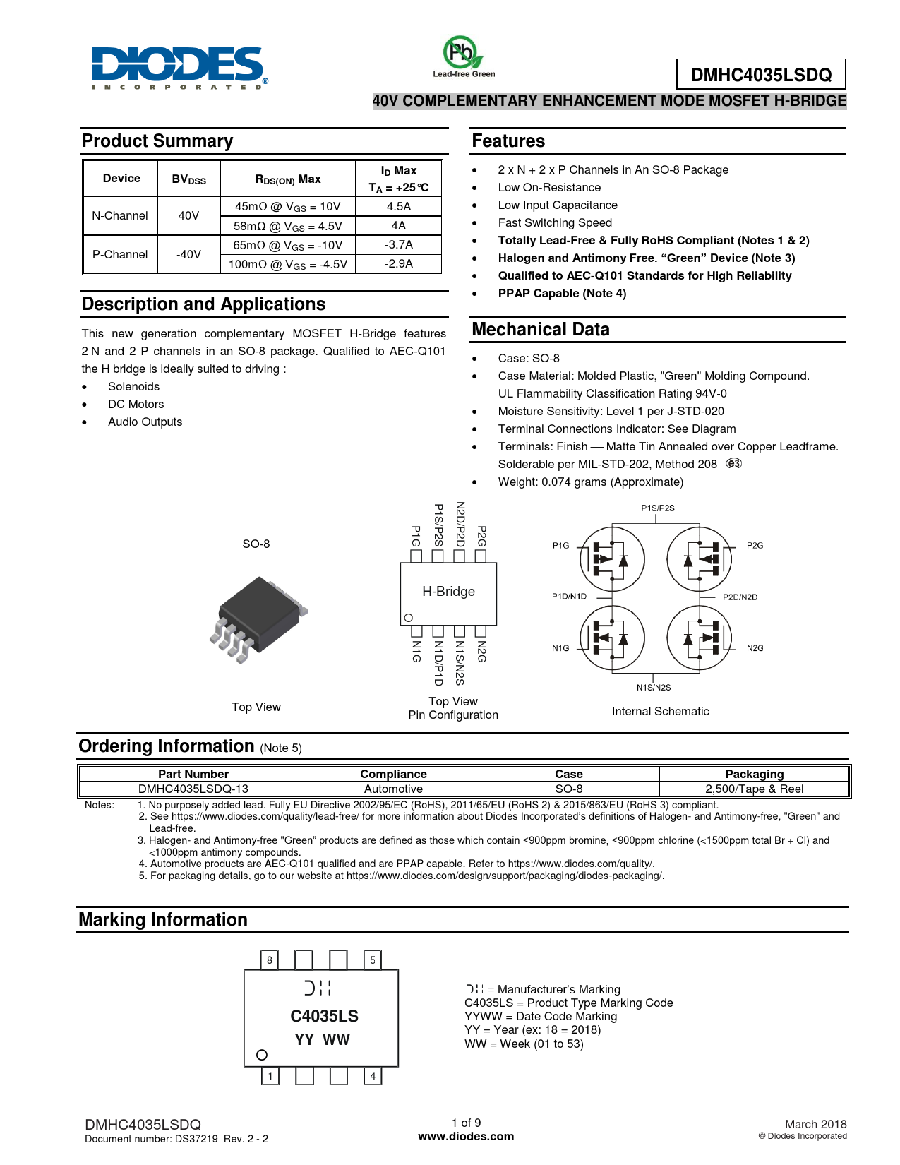 DMHC4035LSDQ-13 Automotive SO-8 2,500/Tape & Reel Notes: 1. No purposely added lead. Fully EU Directive 2002/95/EC (RoHS), 2011/65/EU (RoHS 2) & 2015/863/EU (RoHS 3) compliant. 2. See https://www.diodes.com/quality/lead-free/ for more information about Diodes Incorporated’s definitions of Halogen- and Antimony-free, "Green" and Lead-free. 3. Halogen- and Antimony-free "Green” products are defined as those which contain <900ppm bromine, <900ppm chlorine (<1500ppm total Br + Cl) and <1000ppm antimony compounds. 4. Automotive products are AEC-Q101 qualified and are PPAP capable. Refer to https://www.diodes.com/quality/. 5. For packaging details, go to our website at https://www.diodes.com/design/support/packaging/diodes-packaging/.
