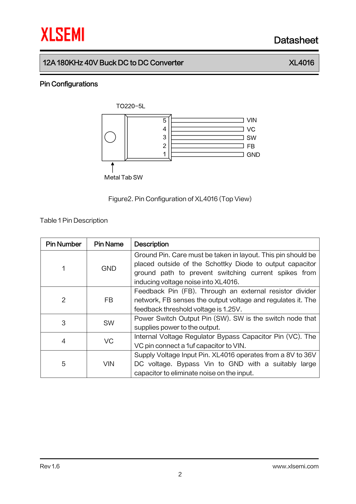Datasheet. 12A. 180KHz. 40V. Buck. DC. to. DC. Converter. XL4016. Pin. Configurations. TO220-5L. 5. VIN. 4. VC. 3. SW. 2. FB. 1. GND. Metal. Tab. SW. Figure2. Pin