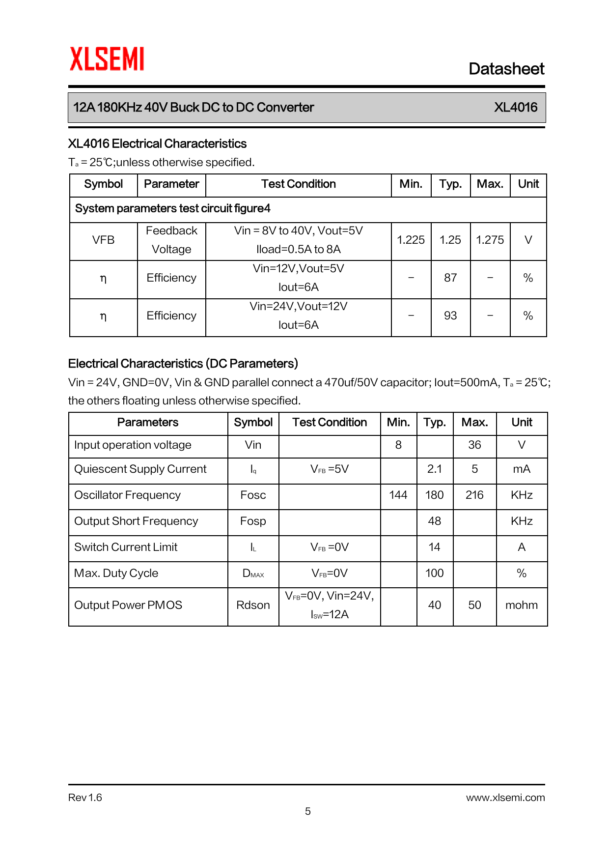 Datasheet 12A 180KHz 40V Buck DC to DC Converter XL4016 XL4016 Electrical Characteristics Ta = 25℃;unless otherwise specified. Symbol Parameter Test Condition Min. Typ. Max. Unit System parameters test circuit figure4 Feedback Vin = 8V to 40V, Vout=5V VFB 1.225 1.25 1.275 V Voltage Iload=0.5A to 8A Vin=12V,Vout=5V η Efficiency - 87 - % Iout=6A Vin=24V,Vout=12V η Efficiency - 93 - % Iout=6A Electrical Characteristics (DC Parameters) Vin = 24V, GND=0V, Vin & GND parallel connect a 470uf/50V capacitor; Iout=500mA, Ta = 25℃; the others floating unless otherwise specified. Parameters Symbol Test Condition Min. Typ. Max. Unit Input operation voltage Vin 8 36 V Quiescent Supply Current Iq VFB =5V 2.1 5 mA Oscillator Frequency Fosc 144 180 216 KHz Output Short Frequency Fosp 48 KHz Switch Current Limit IL VFB =0V 14 A Max. Duty Cycle DMAX VFB=0V 100 % VFB=0V, Vin=24V, Output Power PMOS Rdson 40 50 mohm ISW=12A Rev 1.6 www.xlsemi.com 5