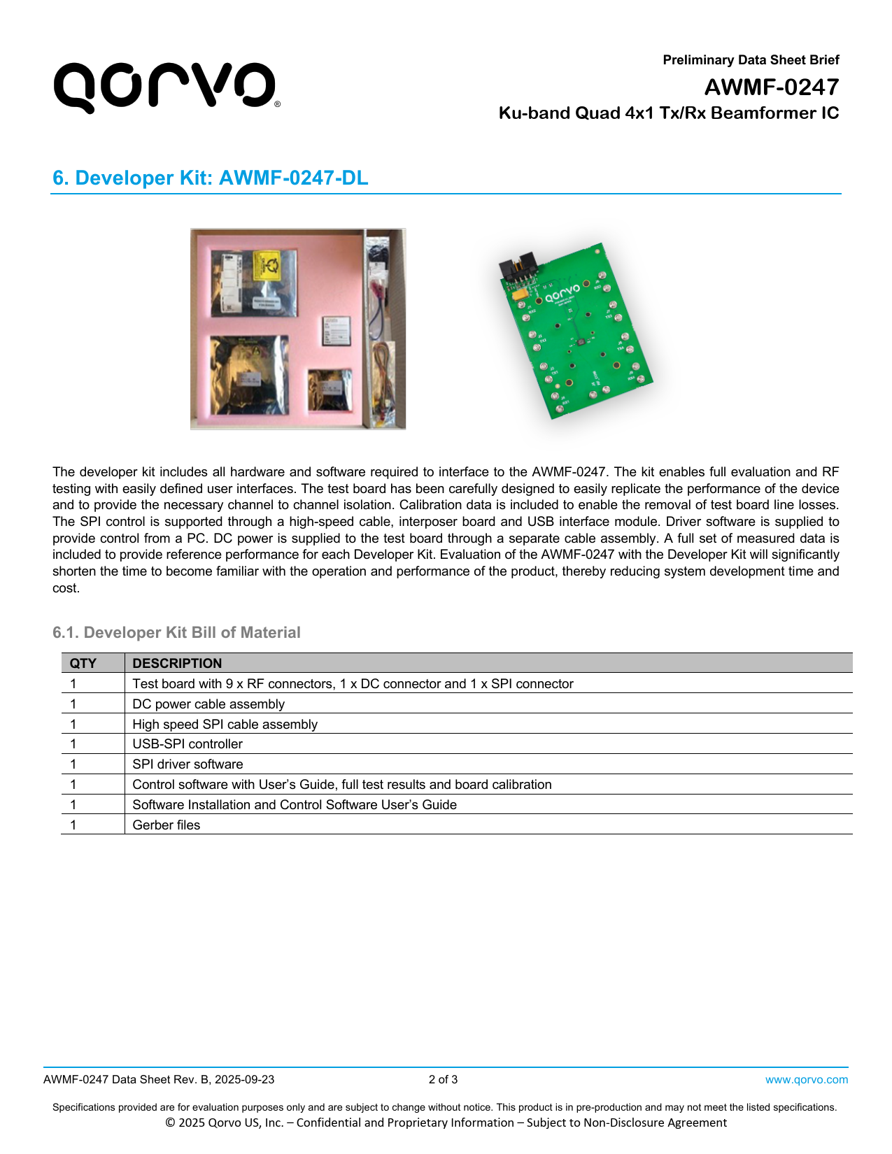 Preliminary Data Sheet Brief. AWMF-0247. Ku-band Quad 4x1 Tx/Rx Beamformer IC. 6. Developer Kit: AWMF-0247-DL