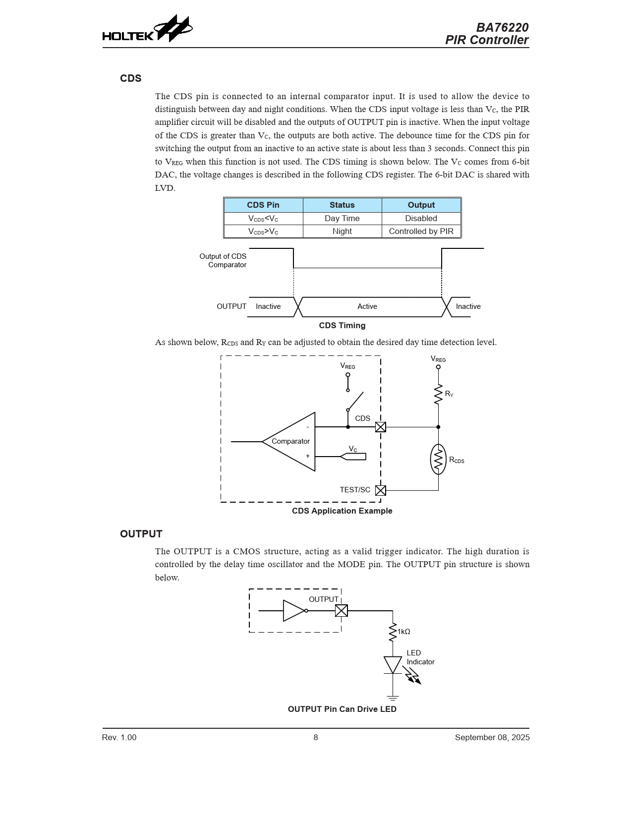 BA76220 PIR Controller CDS CDS Pin Status Output CDS Timing CDS Application Example OUTPUT OUTPUT Pin Can Drive LED