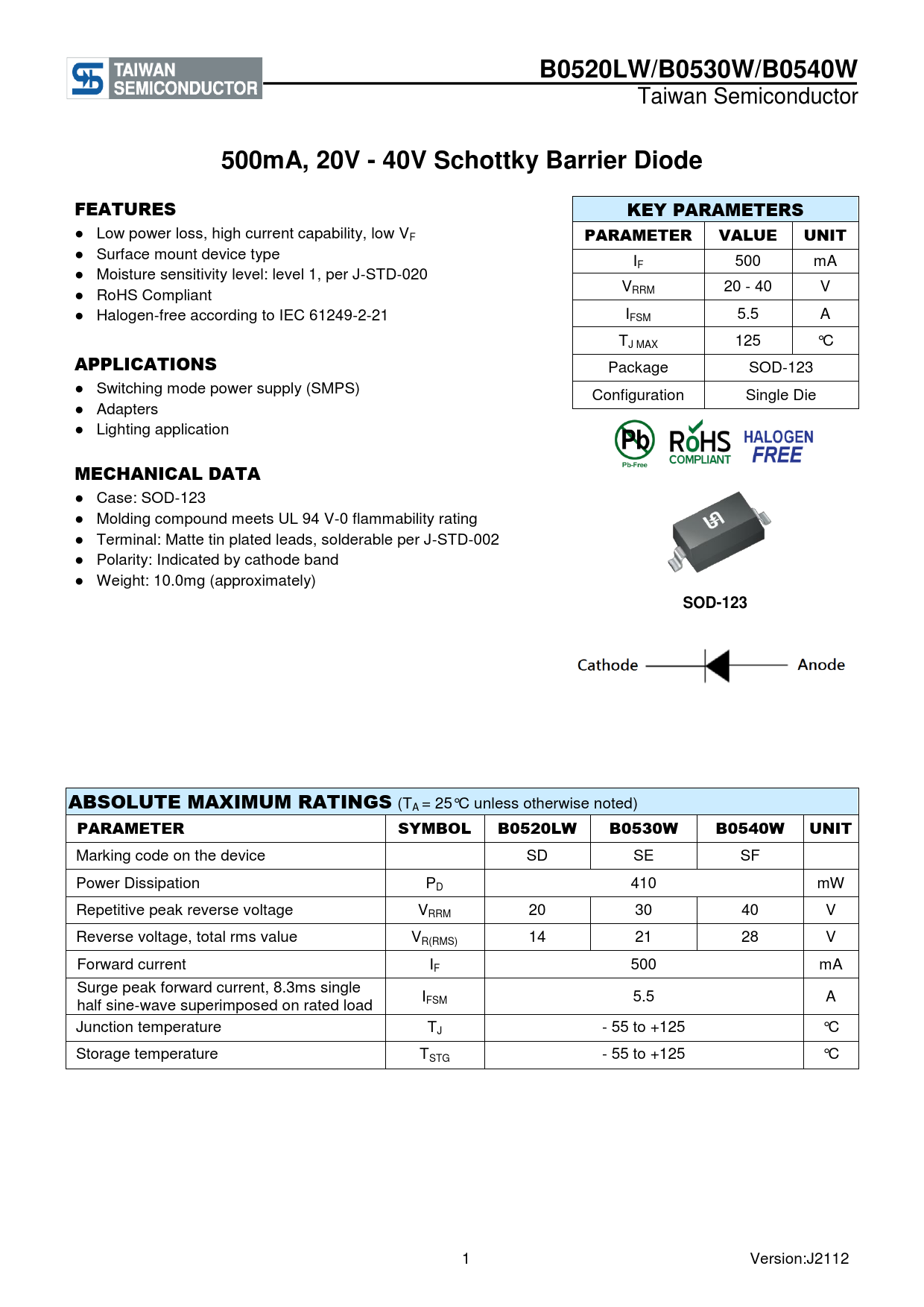 B0520LW/B0530W/B0540W. 500mA, 20V - 40V Schottky Barrier Diode. FEATURES. KEY PARAMETERS. PARAMETER. VALUE. UNIT. APPLICATIONS
