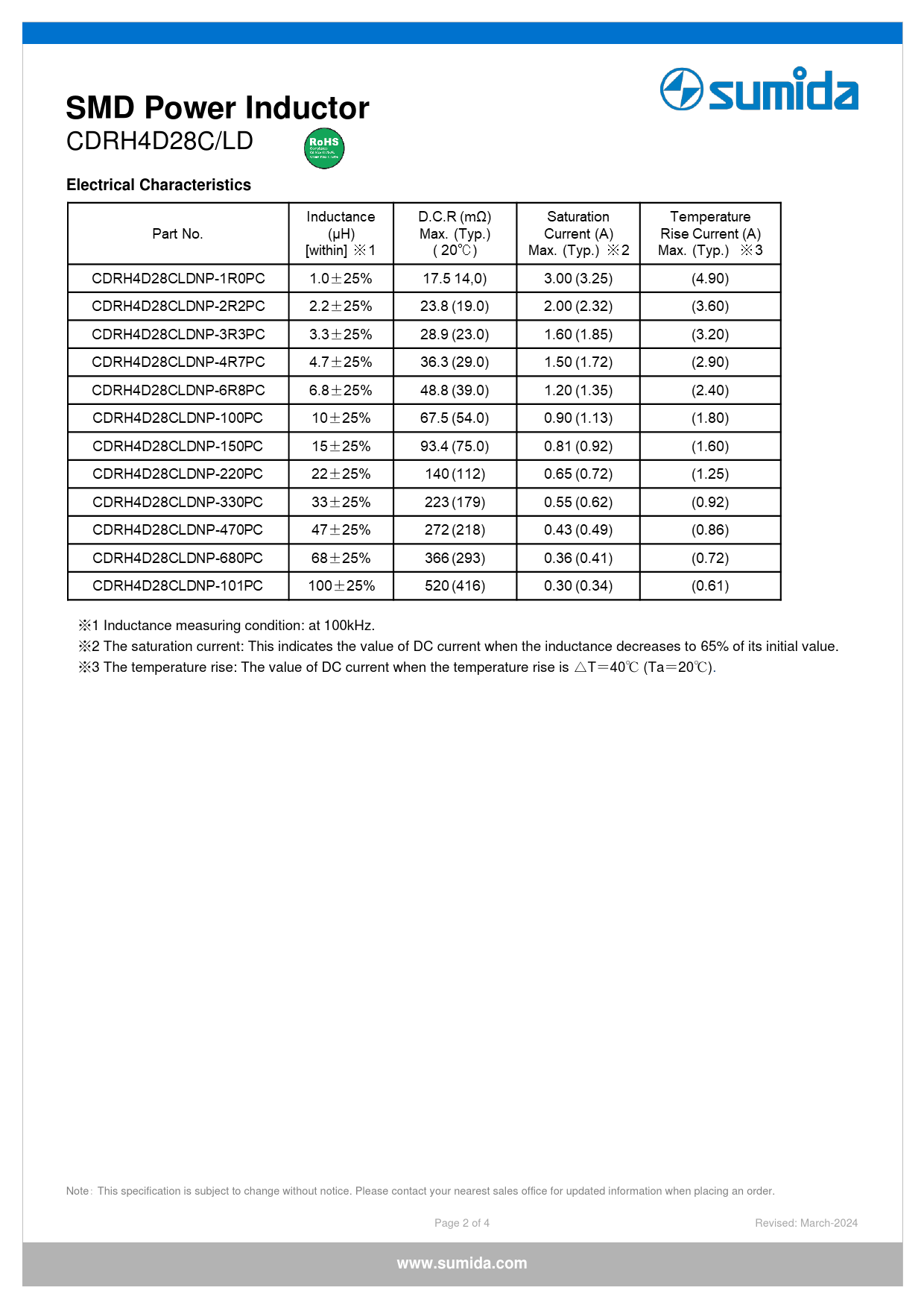 Pages / Page4 / 2 — SMD Power Inductor. Electrical Characteristics. www.sumida.com