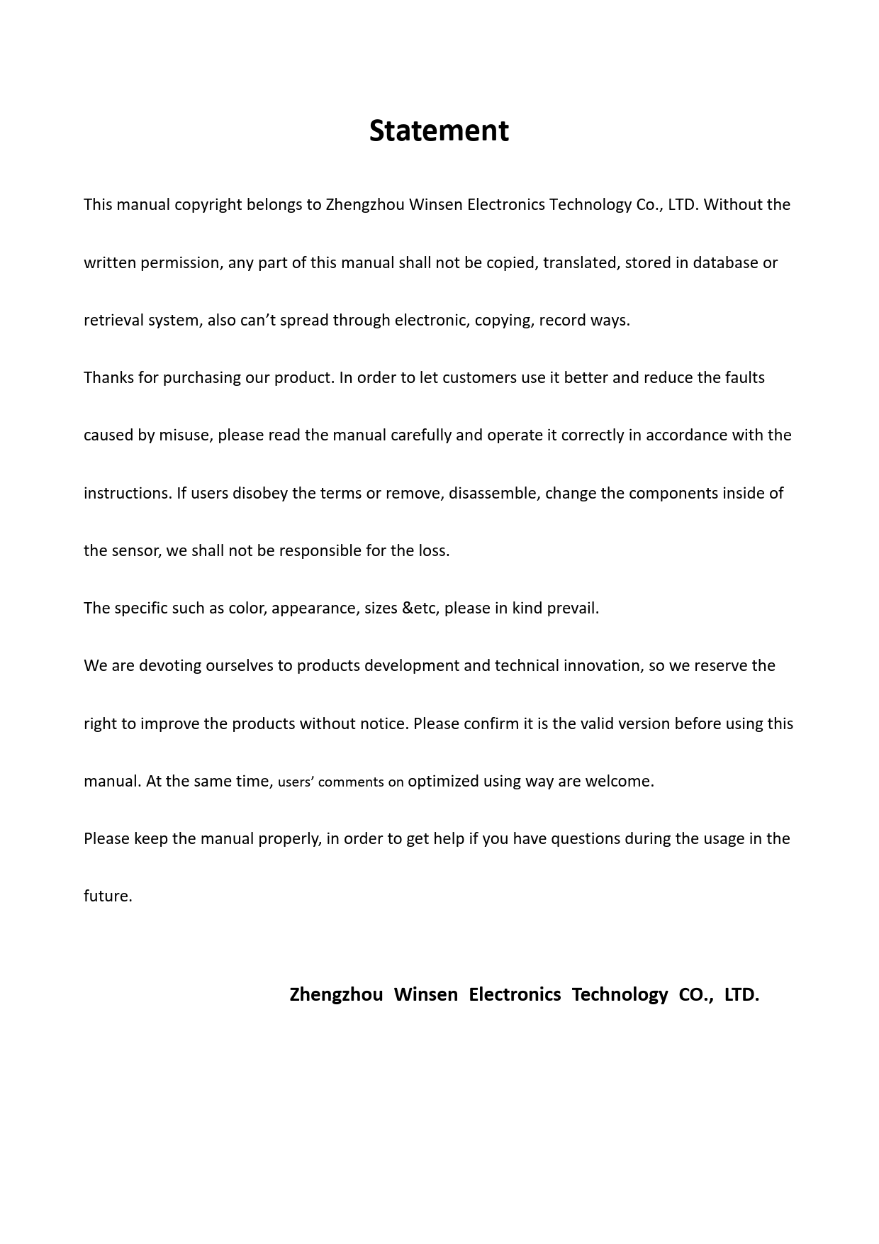 Statement This manual copyright belongs to Zhengzhou Winsen Electronics Technology Co., LTD. Without the written permission, any part of this manual shal not be copied, translated, stored in database or retrieval system, also can’t spread through electronic, copying, record ways. Thanks for purchasing our product. In order to let customers use it better and reduce the faults caused by misuse, please read the manual careful y and operate it correctly in accordance with the instructions. If users disobey the terms or remove, disassemble, change the components inside of the sensor, we shal not be responsible for the loss. The specific such as color, appearance, sizes &etc, please in kind prevail. We are devoting ourselves to products development and technical innovation, so we reserve the right to improve the products without notice. Please confirm it is the valid version before using this manual. At the same time, users’ comments on optimized using way are welcome. Please keep the manual properly, in order to get help if you have questions during the usage in the future. Zhengzhou Winsen Electronics Technology CO., LTD.