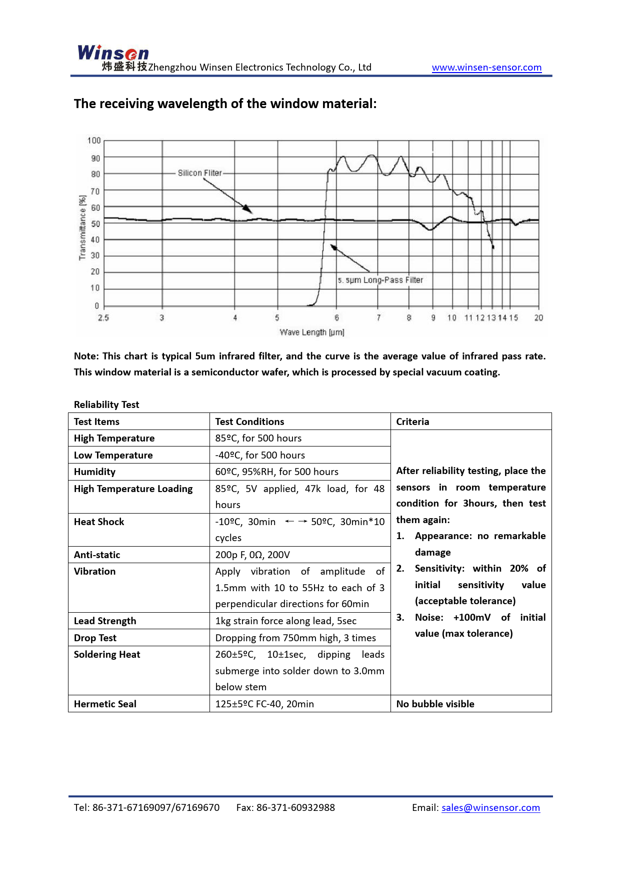 Zhengzhou Winsen Electronics Technology Co., Ltd www.winsen-sensor.com The receiving wavelength of the window material:Note: This chart is typical 5um infrared filter, and the curve is the average value of infrared pass rate. This window material is a semiconductor wafer, which is processed by special vacuum coating.Reliability Test Test ItemsTest ConditionsCriteriaHigh Temperature 85ºC, for 500 hours Low Temperature -40ºC, for 500 hours Humidity 60ºC, 95%RH, for 500 hours After reliability testing, place theHigh Temperature Loading 85ºC, 5V applied, 47k load, for 48 sensors in room temperature hours condition for 3hours, then testHeat Shock -10ºC, 30min ← → 50ºC, 30min*10 them again: cycles 1. Appearance: no remarkableAnti-static 200p F, 0Ω, 200V damage2. Sensitivity: within 20% ofVibration Apply vibration of amplitude of 1.5mm with 10 to 55Hz to each of 3 initialsensitivityvalue perpendicular directions for 60min (acceptable tolerance)3. Noise: +100mV of initialLead Strength 1kg strain force along lead, 5sec value (max tolerance)Drop Test Dropping from 750mm high, 3 times Soldering Heat 260±5ºC, 10±1sec, dipping leads submerge into solder down to 3.0mm below stem Hermetic Seal 125±5ºC FC-40, 20min No bubble visible Tel: 86-371-67169097/67169670 Fax: 86-371-60932988 Email: sales@winsensor.com