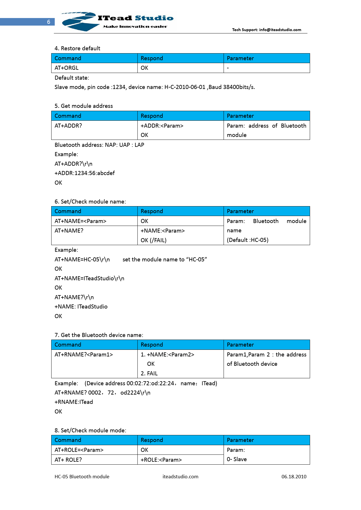 6 Tech Support: info@iteadstudio.com 4. Restore default Command Respond Parameter AT+ORGL OK - Default state: Slave mode, pin code :1234, device name: H-C-2010-06-01 ,Baud 38400bits/s. 5. Get module address Command Respond Parameter AT+ADDR? +ADDR:<Param> Param: address of Bluetooth OK module Bluetooth address: NAP: UAP : LAP Example: AT+ADDR?\r\n +ADDR:1234:56:abcdef OK 6. Set/Check module name: Command Respond Parameter AT+NAME=<Param> OK Param: Bluetooth module AT+NAME? +NAME:<Param> name OK (/FAIL) (Default :HC-05) Example: AT+NAME=HC-05\r\n set the module name to “HC-05” OK AT+NAME=ITeadStudio\r\n OK AT+NAME?\r\n +NAME: ITeadStudio OK 7. Get the Bluetooth device name: Command Respond Parameter AT+RNAME?<Param1> 1. +NAME:<Param2> Param1,Param 2 : the address OK of Bluetooth device 2. FAIL Example: (Device address 00:02:72:od:22:24,name:ITead) AT+RNAME? 0002,72,od2224\r\n +RNAME:ITead OK 8. Set/Check module mode: Command Respond Parameter AT+ROLE=<Param> OK Param: AT+ ROLE? +ROLE:<Param> 0- Slave HC-05 Bluetooth module iteadstudio.com 06.18.2010