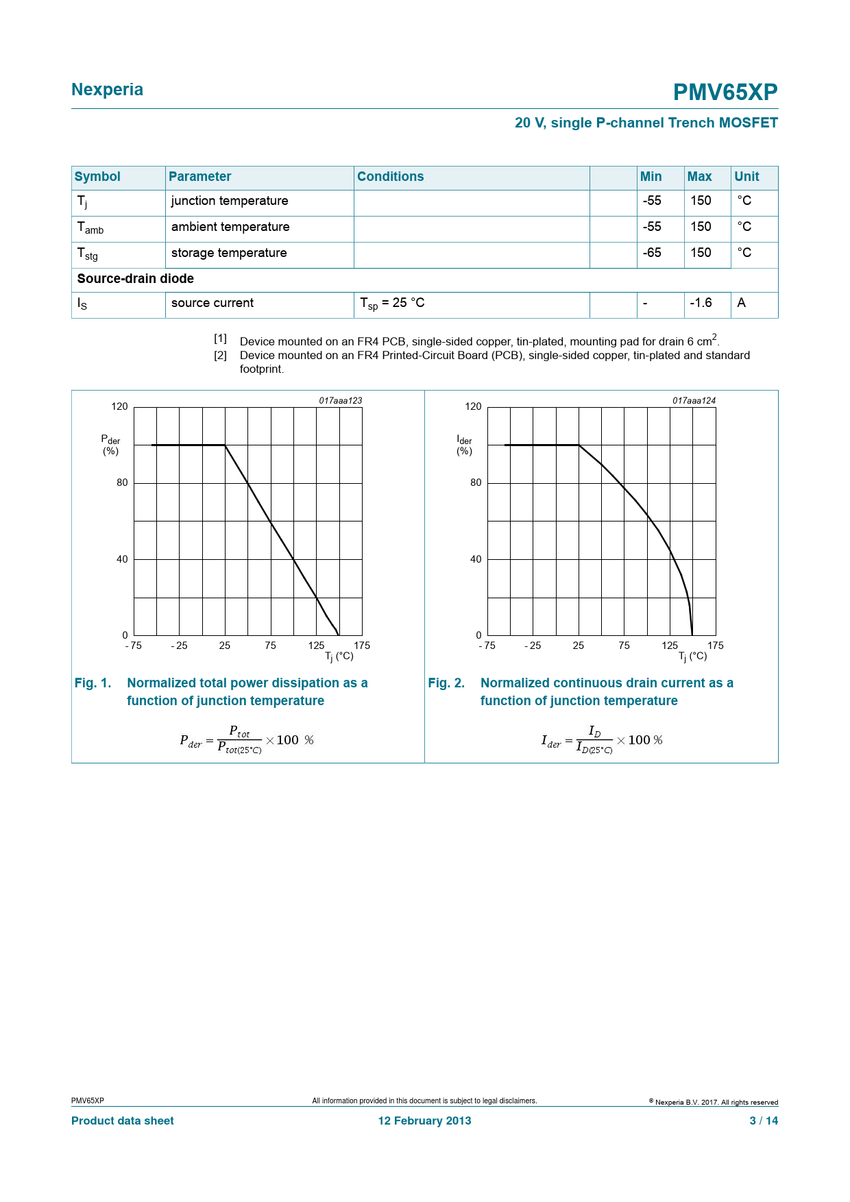 IS source current Tsp = 25 °C - -1.6 A [1] Device mounted on an FR4 PCB, single-sided copper, tin-plated, mounting pad for drain 6 cm2. [2] Device mounted on an FR4 Printed-Circuit Board (PCB), single-sided copper, tin-plated and standard footprint. 017aaa123 120 017aaa124 120 Pder Ider (%) (%) 80 80 40 40 0 0 - 75 - 25 25 75 125 175 - 75 - 25 25 75 125 175 Tj (°C) Tj (°C)