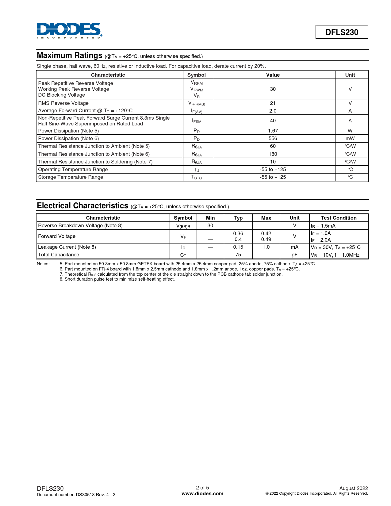 | Pages / Page | 5 / 2 — DFLS230. Maximum Ratings. Characteristic. Symbol. Value. Unit. Electrical … |