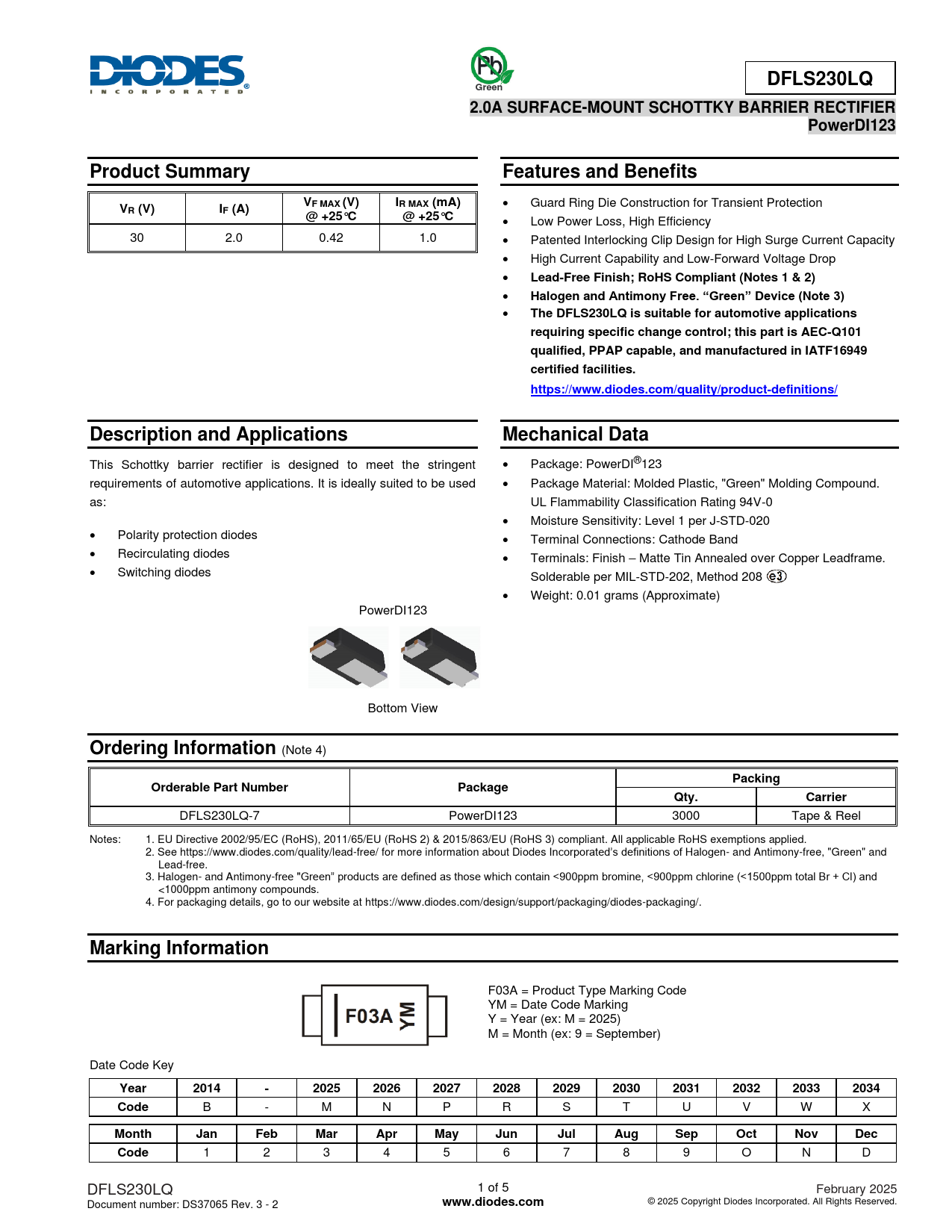 DFLS230LQ. Green. 2.0A SURFACE-MOUNT SCHOTTKY BARRIER RECTIFIER. PowerDI123. Product Summary. Features and Benefits. F MAX (V)