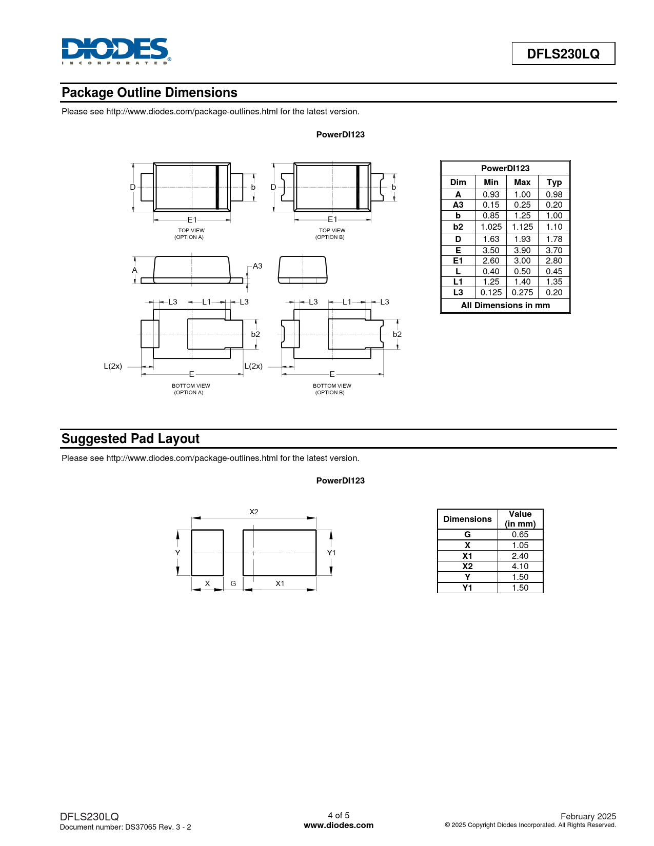 DFLS230LQ. Package Outline Dimensions. PowerDI123. Dim. Min. Max. Typ. All Dimensions in mm. Suggested Pad Layout. Value. Dimensions. (in mm)