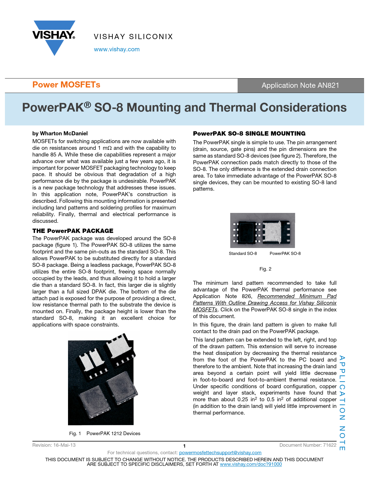 V I S H A Y S I L I C O N I X www.vishay.com Power MOSFETs Application Note AN821 PowerPAK ® SO-8 Mounting and Thermal Considerationsby Wharton McDanielPowerPAK SO-8 SINGLE MOUNTING MOSFETs for switching applications are now available with The PowerPAK single is simple to use. The pin arrangement die on resistances around 1 m and with the capability to (drain, source, gate pins) and the pin dimensions are the handle 85 A. While these die capabilities represent a major same as standard SO-8 devices (see figure 2). Therefore, the advance over what was available just a few years ago, it is PowerPAK connection pads match directly to those of the important for power MOSFET packaging technology to keep SO-8. The only difference is the extended drain connection pace. It should be obvious that degradation of a high area. To take immediate advantage of the PowerPAK SO-8 performance die by the package is undesirable. PowerPAK single devices, they can be mounted to existing SO-8 land is a new package technology that addresses these issues. patterns. In this application note, PowerPAK’s construction is described. Following this mounting information is presented including land patterns and soldering profiles for maximum reliability. Finally, thermal and electrical performance is discussed. THE PowerPAK PACKAGE The PowerPAK package was developed around the SO-8 package (figure 1). The PowerPAK SO-8 utilizes the same footprint and the same pin-outs as the standard SO-8. This Standard SO-8 PowerPAK SO-8 allows PowerPAK to be substituted directly for a standard SO-8 package. Being a leadless package, PowerPAK SO-8 Fig. 2 utilizes the entire SO-8 footprint, freeing space normally occupied by the leads, and thus allowing it to hold a larger die than a standard SO-8. In fact, this larger die is slightly The minimum land pattern recommended to take full larger than a full sized DPAK die. The bottom of the die advantage of the PowerPAK thermal performance see attach pad is exposed for the purpose of providing a direct, Application Note 826, Recommended Minimum Pad low resistance thermal path to the substrate the device is Patterns With Outline Drawing Access for Vishay Siliconix mounted on. Finally, the package height is lower than the MOSFETs. Click on the PowerPAK SO-8 single in the index standard SO-8, making it an excellent choice for of this document. applications with space constraints. In this figure, the drain land pattern is given to make full contact to the drain pad on the PowerPAK package. This land pattern can be extended to the left, right, and top of the drawn pattern. This extension will serve to increase the heat dissipation by decreasing the thermal resistance APPLIC from the foot of the PowerPAK to the PC board and therefore to the ambient. Note that increasing the drain land area beyond a certain point will yield little decrease in foot-to-board and foot-to-ambient thermal resistance. Under specific conditions of board configuration, copper ATION N weight and layer stack, experiments have found that more than about 0.25 in2 to 0.5 in2 of additional copper (in addition to the drain land) will yield little improvement in thermal performance. O Fig. 1 PowerPAK 1212 Devices TE Revision: 16-Mai-13 1 Document Number: 71622 For technical questions, contact: powermosfettechsupport@vishay.com THIS DOCUMENT IS SUBJECT TO CHANGE WITHOUT NOTICE. THE PRODUCTS DESCRIBED HEREIN AND THIS DOCUMENT ARE SUBJECT TO SPECIFIC DISCLAIMERS, SET FORTH AT www.vishay.com/doc?91000