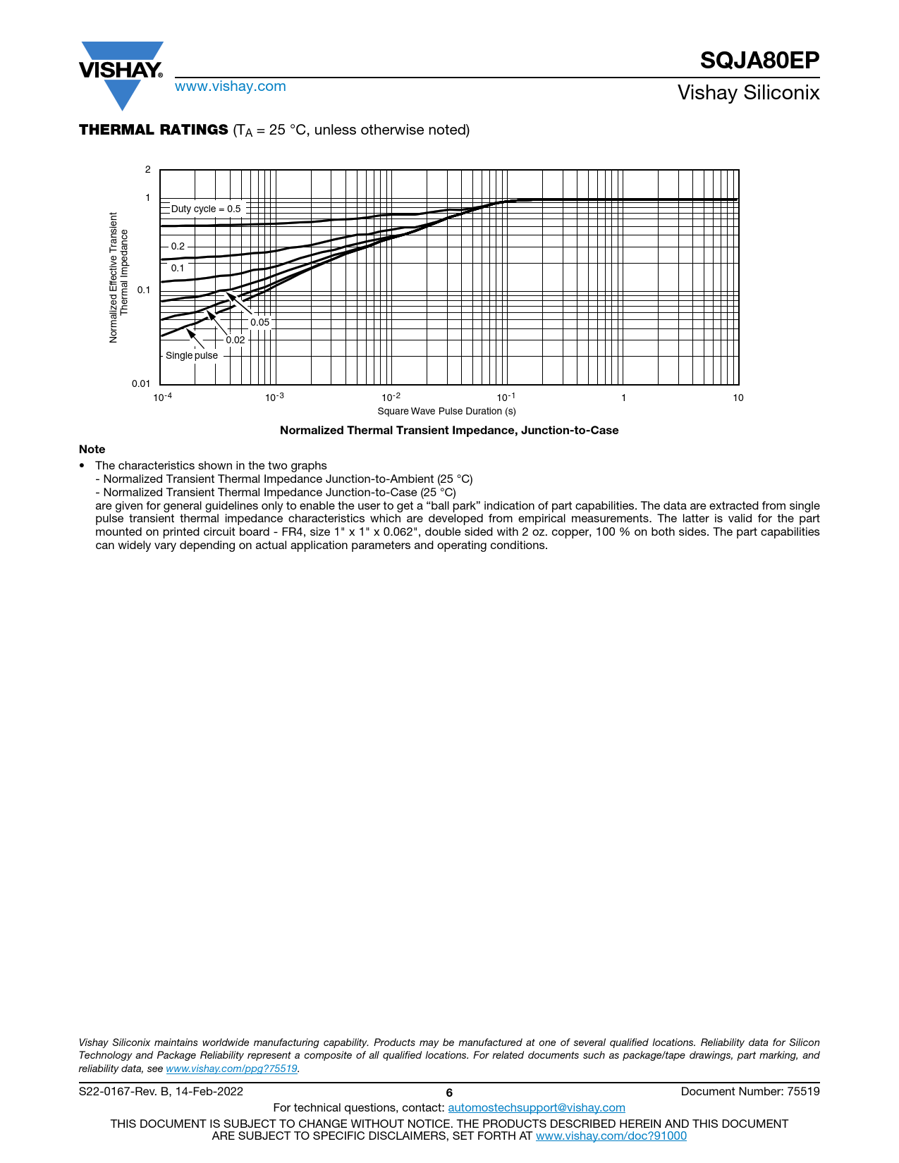 SQJA80EP www.vishay.com Vishay Siliconix THERMAL RATINGS (TA = 25 °C, unless otherwise noted) 2 1 Duty cycle = 0.5 ransient 0.2 T e v 0.1 fecti Ef 0.1 rmal Impedance ed z The 0.05 rmali No 0.02 Single pulse 0.01 10-3 10-2 10-1 10-4 1 10 Square Wave Pulse Duration (s) Normalized Thermal Transient Impedance, Junction-to-CaseNote • The characteristics shown in the two graphs - Normalized Transient Thermal Impedance Junction-to-Ambient (25 °C) - Normalized Transient Thermal Impedance Junction-to-Case (25 °C) are given for general guidelines only to enable the user to get a “ball park” indication of part capabilities. The data are extracted from single pulse transient thermal impedance characteristics which are developed from empirical measurements. The latter is valid for the part mounted on printed circuit board - FR4, size 1" x 1" x 0.062", double sided with 2 oz. copper, 100 % on both sides. The part capabilities can widely vary depending on actual application parameters and operating conditions. Vishay Siliconix maintains worldwide manufacturing capability. Products may be manufactured at one of several qualified locations. Reliability data for Silicon Technology and Package Reliability represent a composite of all qualified locations. For related documents such as package/tape drawings, part marking, and reliability data, see www.vishay.com/ppg?75519. S22-0167-Rev. B, 14-Feb-2022 6 Document Number: 75519 For technical questions, contact: automostechsupport@vishay.com THIS DOCUMENT IS SUBJECT TO CHANGE WITHOUT NOTICE. THE PRODUCTS DESCRIBED HEREIN AND THIS DOCUMENT ARE SUBJECT TO SPECIFIC DISCLAIMERS, SET FORTH AT www.vishay.com/doc?91000