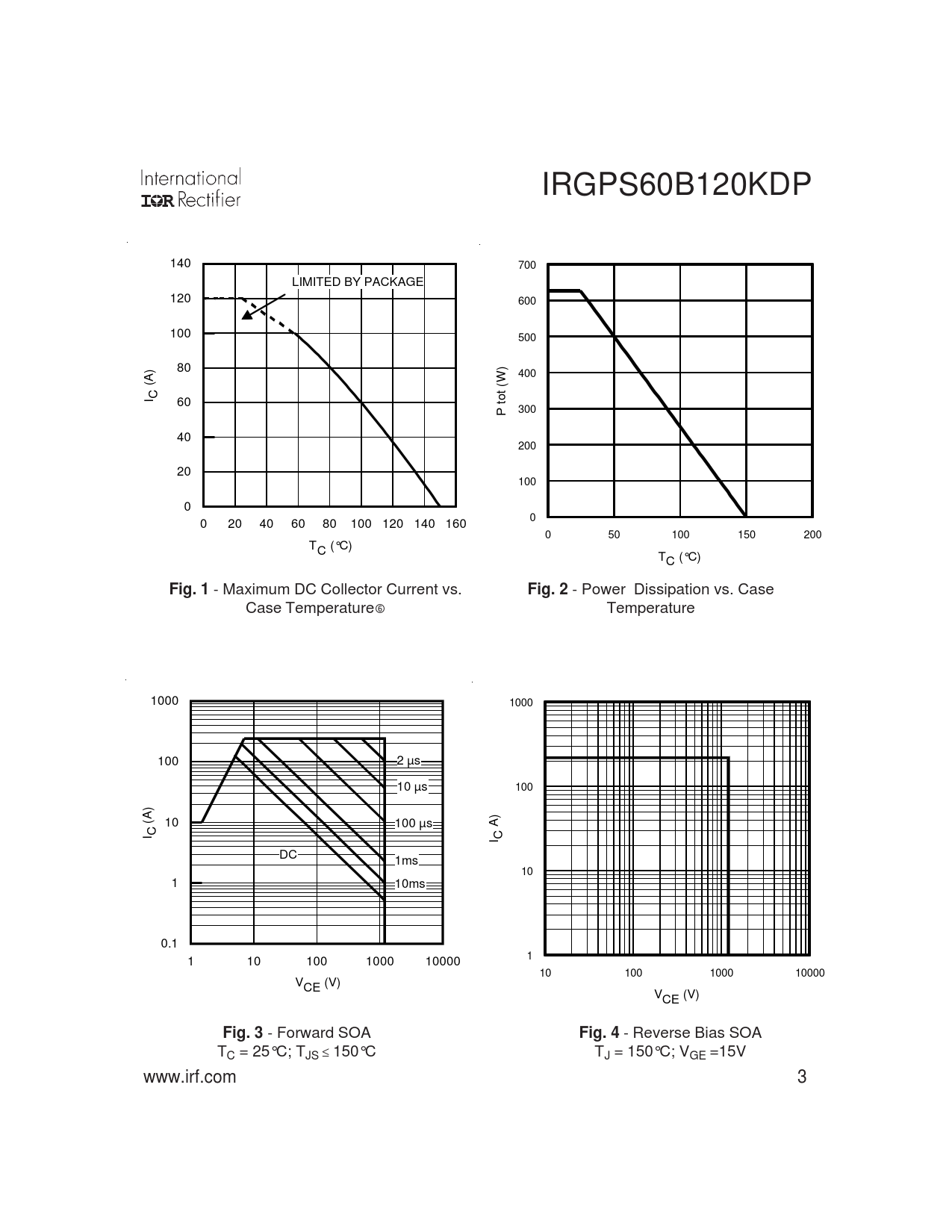 IRGPS60B120KDP 140 700 LIMITED BY PACKAGE 120 600 100 500 ) 80 ) 400 A W ( t I C o 60 t 300 P 40 200 20 100 0 0 0 20 40 60 80 100 120 140 160 0 50 100 150 200 TC (°C) TC (°C) Fig. 1 - Maximum DC Collector Current vs. Fig. 2 - Power Dissipation vs. Case Case Temperature Temperature 1000 1000 100 2 µs 10 µs 100 ) A( ) 10 100 µs A I C I C DC 1ms 10 1 10ms 0.1 1 10 100 1000 10000 1 10 100 1000 10000 VCE (V) VCE (V) Fig. 3 - Forward SOA Fig. 4 - Reverse Bias SOA TC = 25°C; TJS ≤ 150°C TJ = 150°C; VGE =15V www.irf.com 3