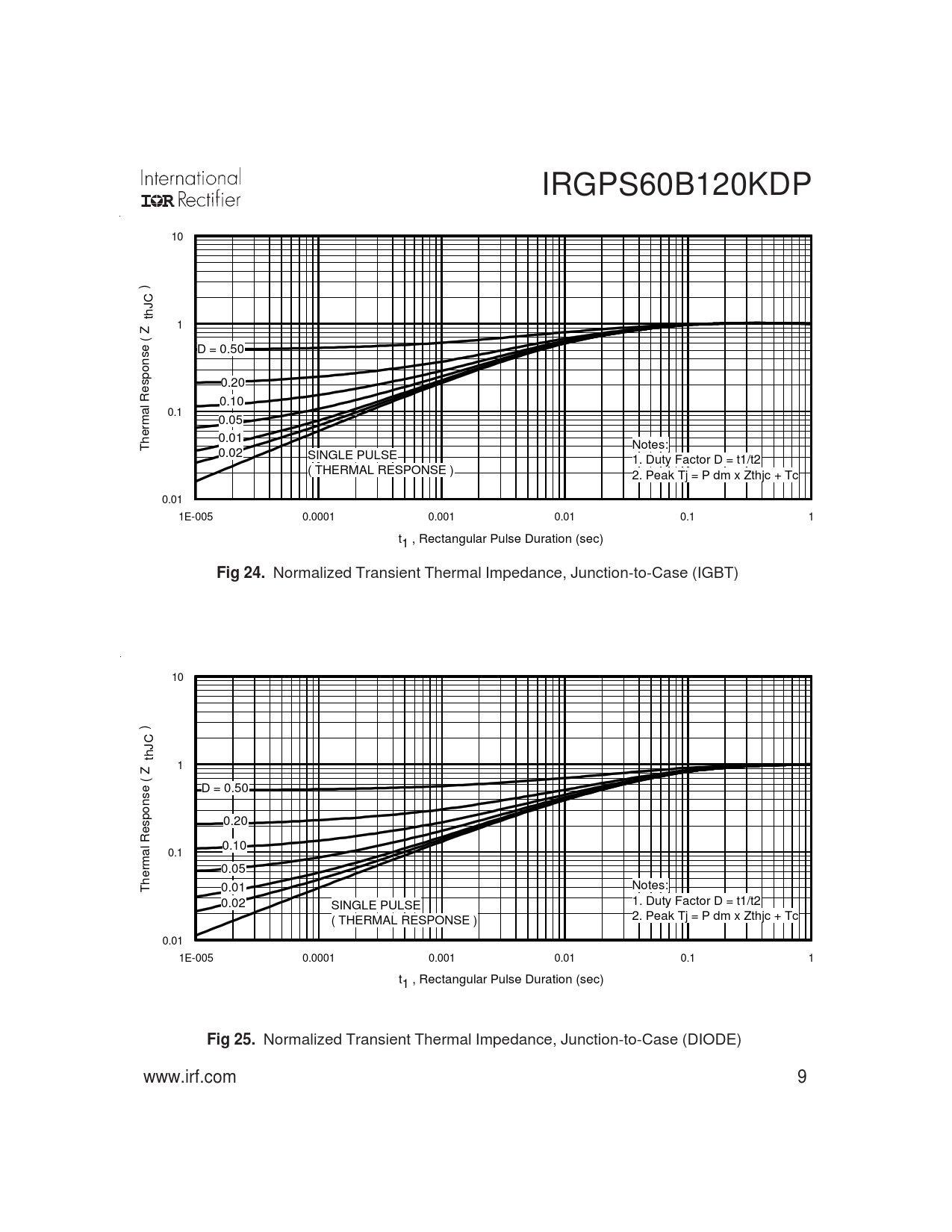 IRGPS60B120KDP 10 ) CJht 1 Z ( es D = 0.50 n o p s 0.20 e R l 0.10 a 0.1 mr 0.05 e h 0.01 T Notes: 0.02 SINGLE PULSE 1. Duty Factor D = t1/t2 ( THERMAL RESPONSE ) 2. Peak Tj = P dm x Zthjc + Tc 0.01 1E-005 0.0001 0.001 0.01 0.1 1 t1 , Rectangular Pulse Duration (sec) Fig 24. Normalized Transient Thermal Impedance, Junction-to-Case (IGBT) 10 ) CJht 1 Z ( e D = 0.50 s n o p s 0.20 e R l 0.10 a 0.1 mre 0.05 h T 0.01 Notes: 0.02 SINGLE PULSE 1. Duty Factor D = t1/t2 ( THERMAL RESPONSE ) 2. Peak Tj = P dm x Zthjc + Tc 0.01 1E-005 0.0001 0.001 0.01 0.1 1 t1 , Rectangular Pulse Duration (sec) Fig 25. Normalized Transient Thermal Impedance, Junction-to-Case (DIODE) www.irf.com 9