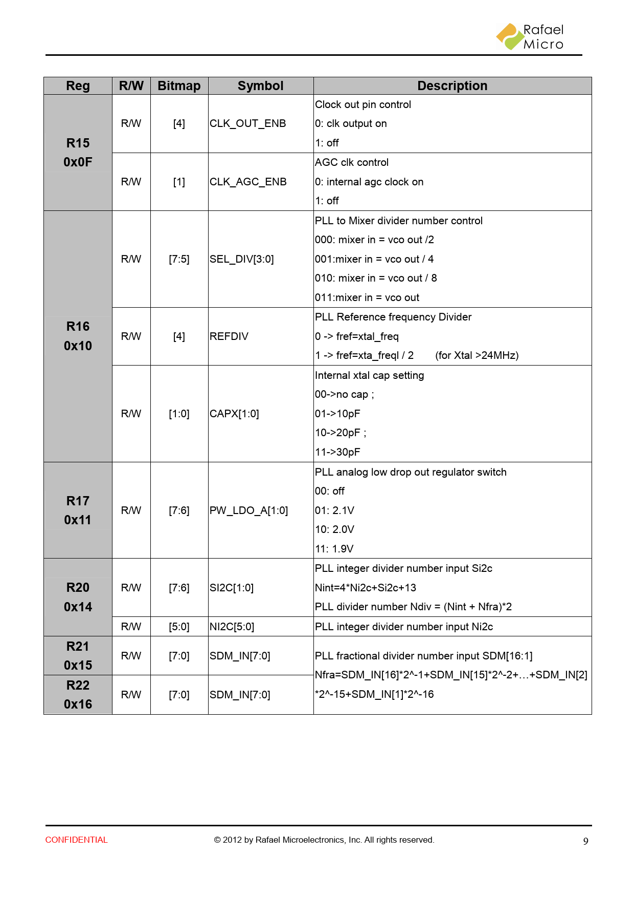 | Pages / Page | 11 / 9 — Reg. R/W Bitmap. Symbol. Description. R15. 0x0F. R16. 0x10. R17. 0x11. … |