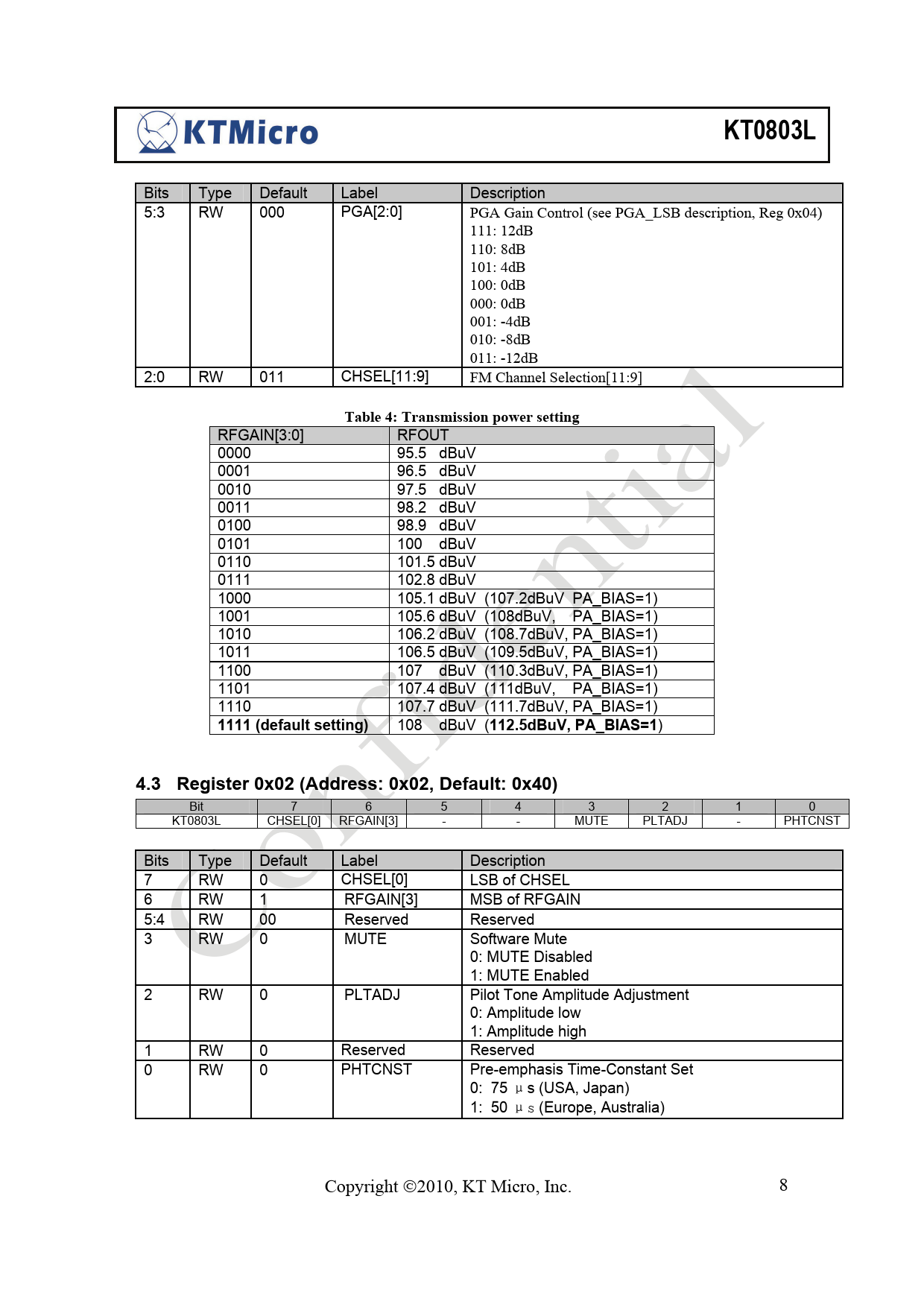 Bit 7 6 5 4 3 2 1 0 KT0803L CHSEL[0] RFGAIN[3] - - MUTE PLTADJ - PHTCNST Bits Type Default Label Description 7 RW 0 CHSEL[0] LSB of CHSEL 6 RW 1 RFGAIN[3] MSB of RFGAIN 5:4 RW 00 Reserved Reserved 3 RW 0 MUTE Software Mute 0: MUTE Disabled 1: MUTE Enabled 2 RW 0 PLTADJ Pilot Tone Amplitude Adjustment 0: Amplitude low 1: Amplitude high 1 RW 0 Reserved Reserved 0 RW 0 PHTCNST Pre-emphasis Time-Constant Set 0: 75 μs (USA, Japan) 1: 50 μs (Europe, Australia) Copyright ©2010, KT Micro, Inc. 8