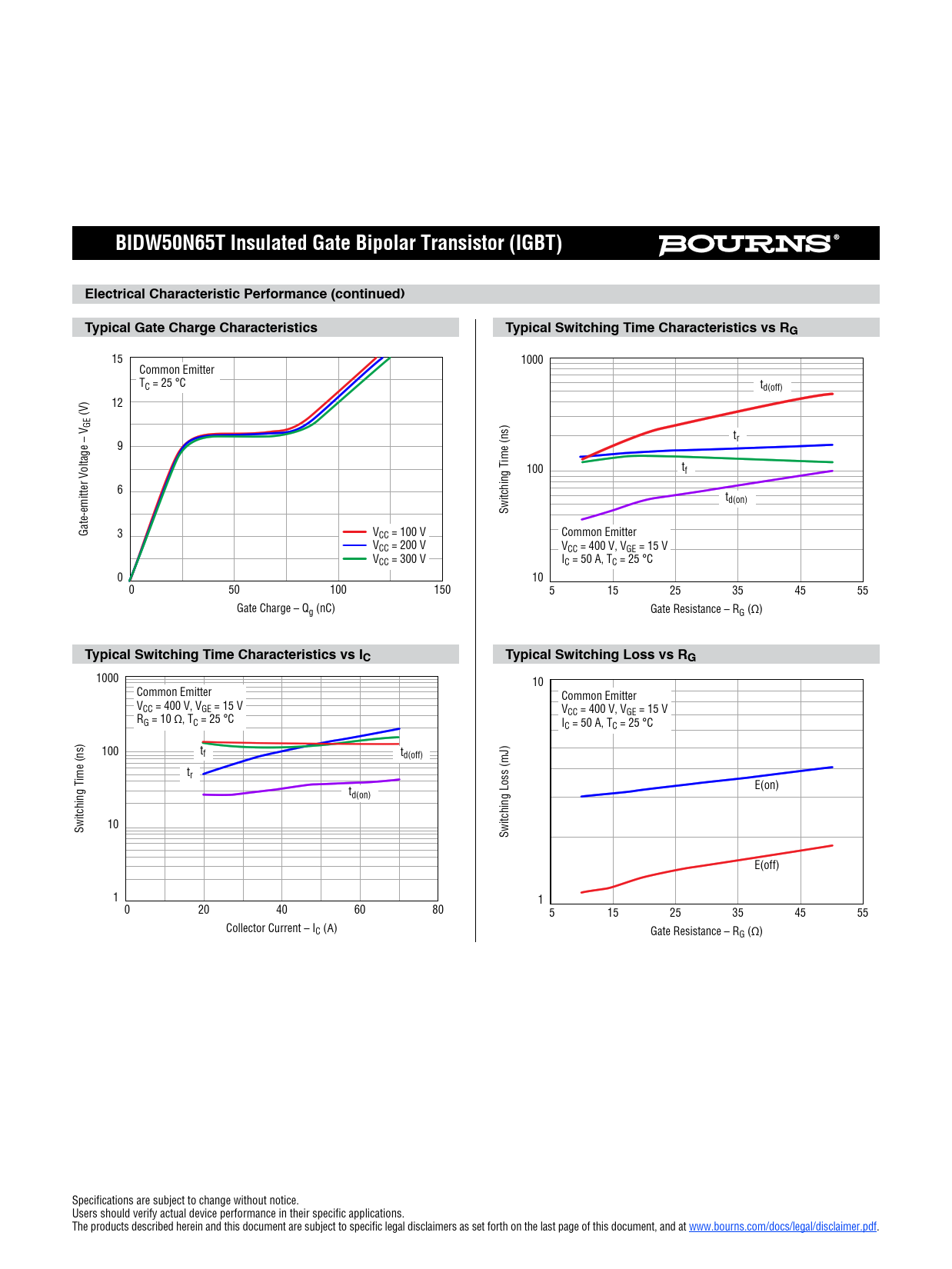 1000 10 Common Emitter Common Emitter VCC = 400 V, VGE = 15 V VCC = 400 V, VGE = 15 V RG = 10 Ω, TC = 25 °C IC = 50 A, TC = 25 °C 100 tf td(off) tr E(on) td(on) 10 Switching Time (ns) Switching Loss (mJ) E(off) 1 1 0 20 40 60 80 5 15 25 35 45 55 Collector Current – IC (A) Gate Resistance – RG (Ω) Specifications are subject to change without notice. Users should verify actual device performance in their specific applications. The products described herein and this document are subject to specific legal disclaimers as set forth on the last page of this document, and at www.bourns.com/docs/legal/disclaimer.pdf.
