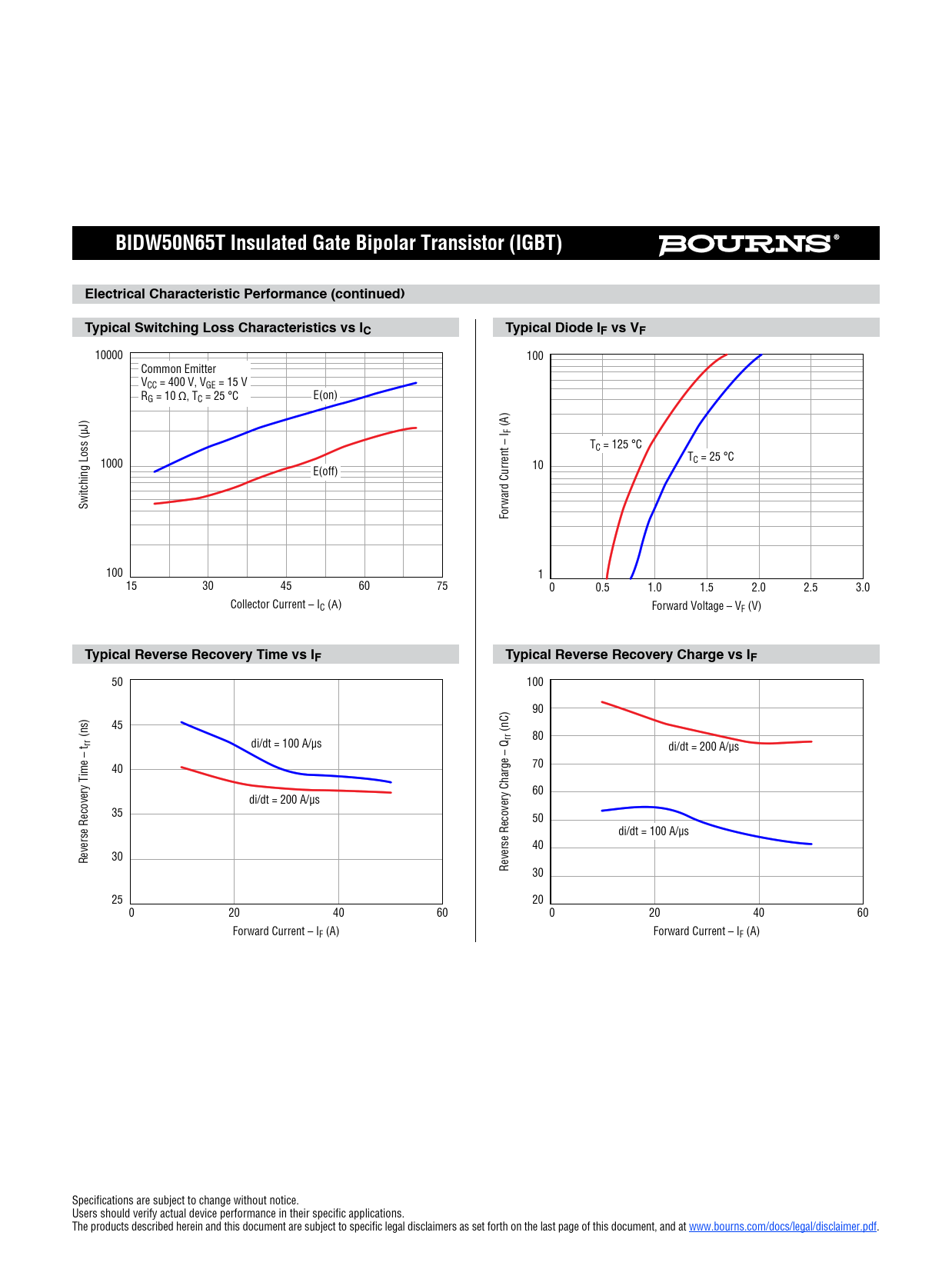 50 100 90 45 (ns) (nC) rr 80 rr di/dt = 100 A/µs di/dt = 200 A/µs 40 70 60 di/dt = 200 A/µs 35 50 di/dt = 100 A/µs 40 30 Reverse Recovery Time – t Reverse Recovery Charge – Q 30 25 20 0 20 40 60 0 20 40 60 Forward Current – IF (A) Forward Current – IF (A) Specifications are subject to change without notice. Users should verify actual device performance in their specific applications. The products described herein and this document are subject to specific legal disclaimers as set forth on the last page of this document, and at www.bourns.com/docs/legal/disclaimer.pdf.