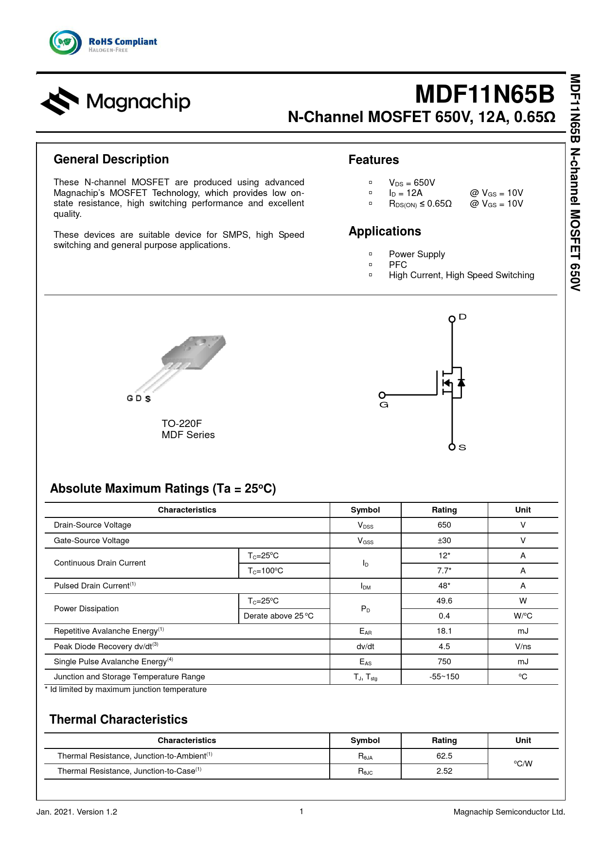 MDF11N65B. 1 N65. N-Channel MOSFET 650V, 12A, 0.65Ω. General Description. Features. nnel. MOS. Applications. FET