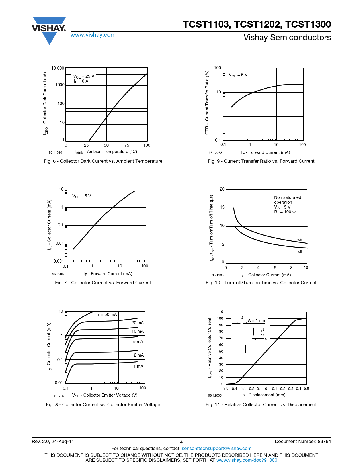 www.vishay.com Vishay Semiconductors 10 000 100 V V CE = 25 V CE = 5 V I F = 0 A 1000 10 100 1 10 - Collector Dark Current (nA) I CEO CTR - Current Transfer Ratio (%) 1 0.1 0 25 50 75 100 0.1 1 10 100 95 11090 T amb - Ambient Temperature (°C) 96 12068 I F - Forward Current (mA) Fig. 6 - Collector Dark Current vs. Ambient Temperature Fig. 9 - Current Transfer Ratio vs. Forward Current 10 20 VCE = 5 V Non saturated operation 1 15 V S = 5 V R L = 100 Ω 0.1 10 /Turn off Time (µs) t on - Collector Current (mA) 0.01 - Turn on 5 I C off t off / t on 0.001 t 0 0.1 1 10 100 0 2 4 6 8 10 96 12066 I F - Forward Current (mA) 95 11086 I C - Collector Current (mA) Fig. 7 - Collector Current vs. Forward Current Fig. 10 - Turn-off/Turn-on Time vs. Collector Current 10 110 I F = 50 mA 100 0 A = 1 mm 20 mA 90 10 mA 80 1 70 s 5 mA 60 50 2 mA 0.1 40 - Collector Current (mA) 30 1 mA - Relative Collector Current I C 20 I Crel 10 0.01 0 0.1 1 10 100 - 0.5 - 0.4 - 0.3 - 0.2- 0.1 0 0.1 0.2 0.3 0.4 0.5 96 12067 V CE - Collector Emitter Voltage (V) 96 12005 s - Displacement (mm) Fig. 8 - Collector Current vs. Collector Emitter Voltage Fig. 11 - Relative Collector Current vs. Displacement Rev. 2.0, 24-Aug-11
