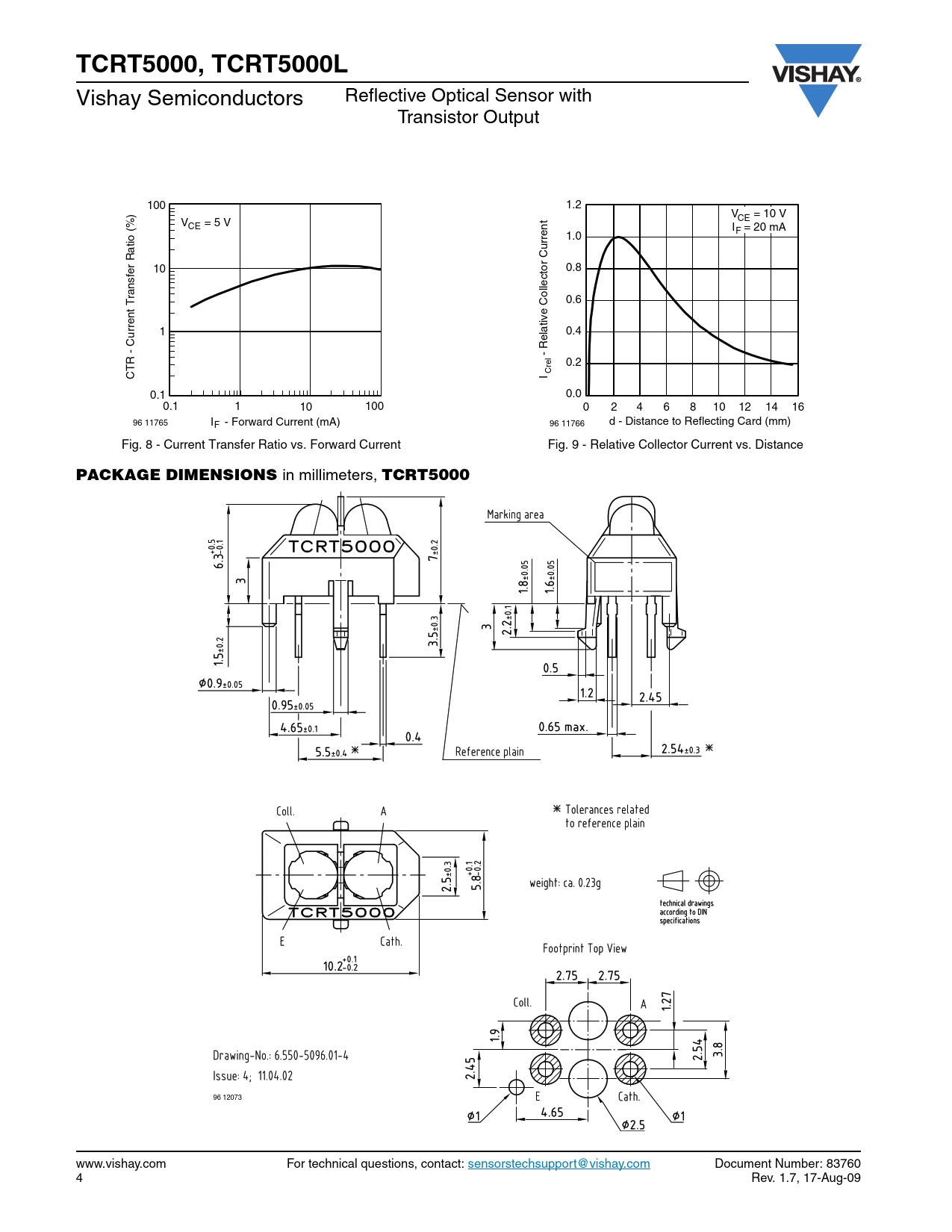 TCRT5000, TCRT5000L Vishay Semiconductors Reflective Optical Sensor with Transistor Output 100 1.2 ) V CE = 10 V % V CE = 5 V I F = 20 mA 1.0 rrent u C 10 0.8 ollector 0.6 C e v rrent Transfer Ratio ( 1 u 0.4 Relati 0.2 Crel CTR - C I - 0.1 0.0 0.1 1 10 100 0 2 4 6 8 10 12 14 16 96 11765 I F - Forward Current (mA) 96 11766 d - Distance to Reflecting Card (mm) Fig. 8 - Current Transfer Ratio vs. Forward Current Fig. 9 - Relative Collector Current vs. Distance PACKAGE DIMENSIONS in millimeters, TCRT5000 96 12073 www.vishay.com For technical questions, contact: sensorstechsupport@vishay.com Document Number: 83760 4 Rev. 1.7, 17-Aug-09