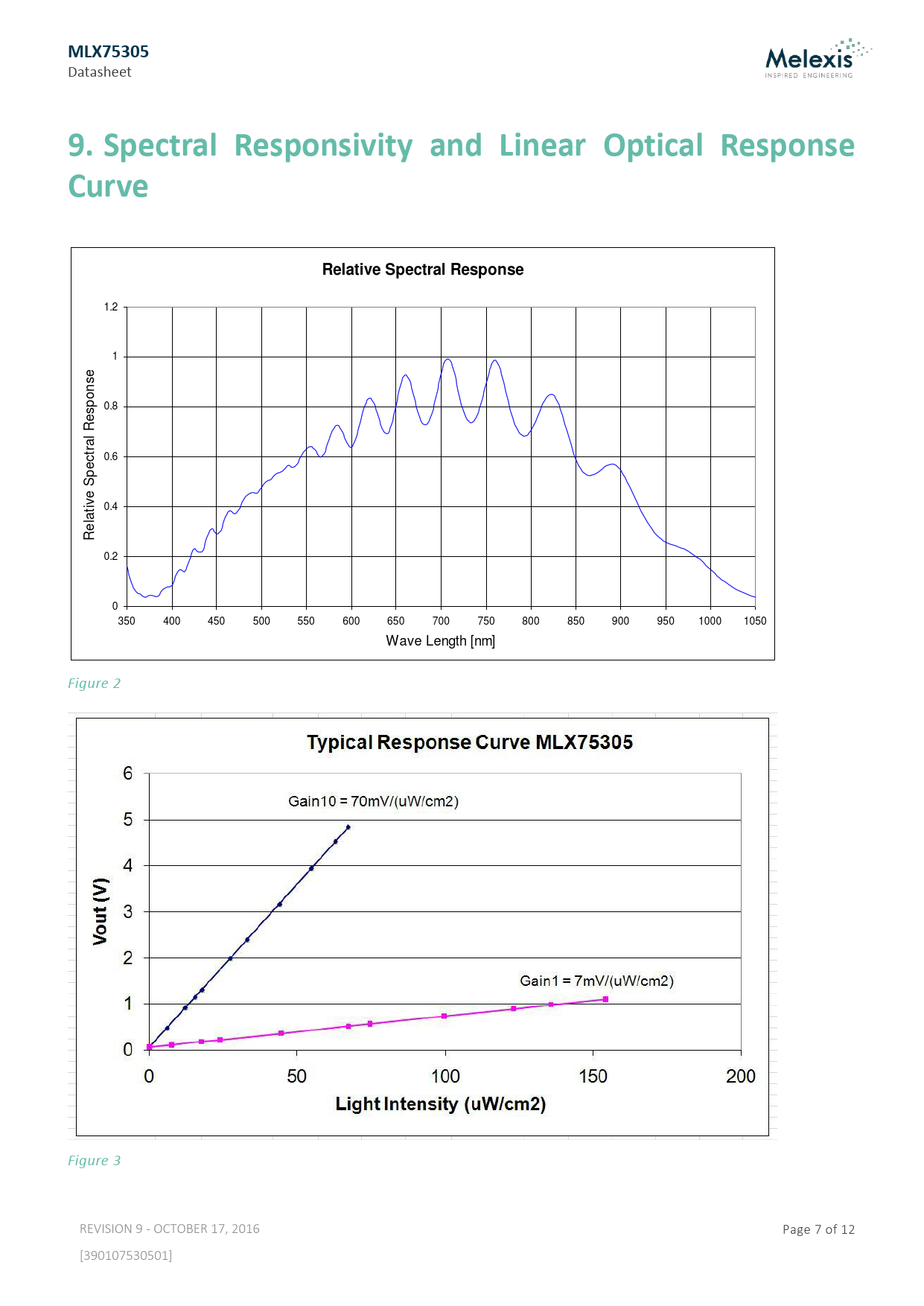 Pages / Page12 / 7 — MLX75305. 9. Spectral Responsivity and Linear Optical Response Curve. …