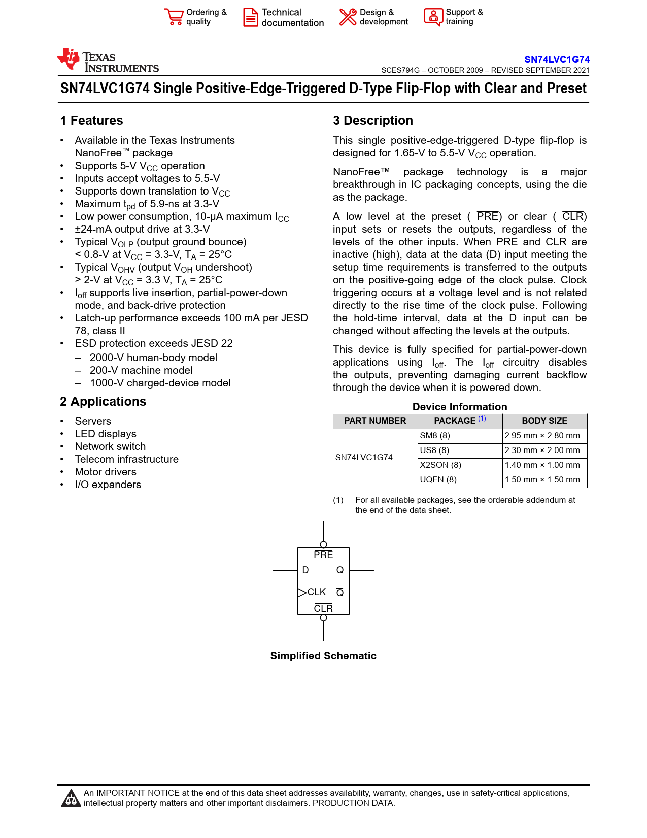 • LED displays SM8 (8) 2.95 mm × 2.80 mm • Network switch US8 (8) 2.30 mm × 2.00 mm • Telecom infrastructure SN74LVC1G74 X2SON (8) 1.40 mm × 1.00 mm • Motor drivers • I/O expanders UQFN (8) 1.50 mm × 1.50 mm (1) For all available packages, see the orderable addendum at the end of the data sheet. PRE D Q CLK Q CLR