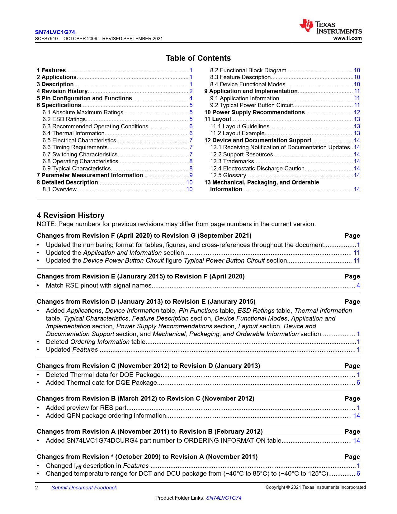 | Pages / Page | 31 / 2 — SN74LVC1G74. www.ti.com. Table of Contents. 1 Features. 2 Applications. 3 … |