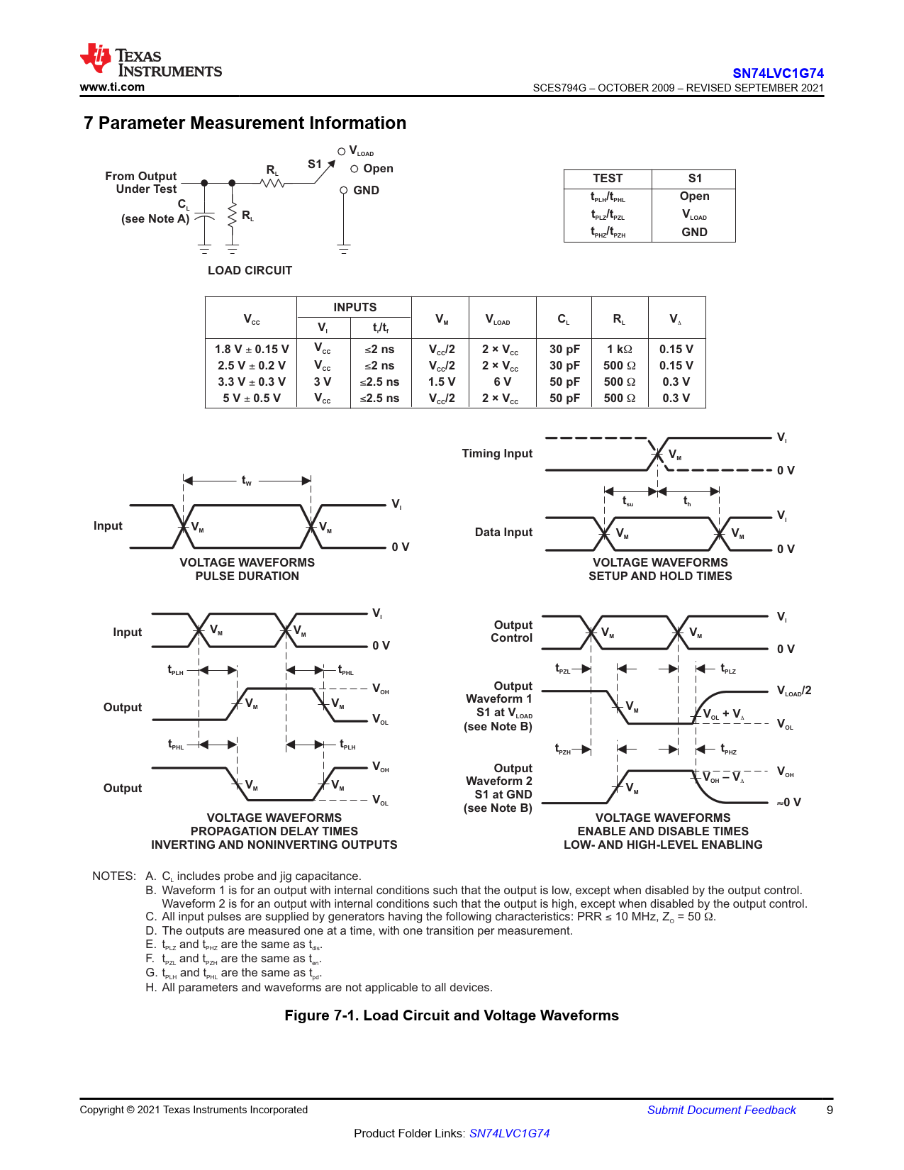 | Pages / Page | 31 / 9 — SN74LVC1G74. www.ti.com. 7 Parameter Measurement Information. VLOAD. … |