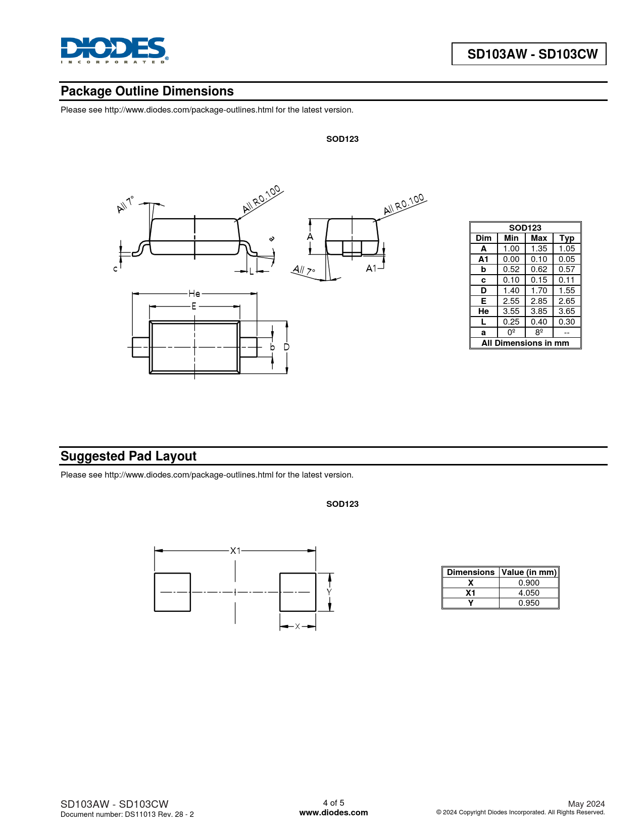 SD103AW - SD103CW. Package Outline Dimensions. SOD123. Dim. Min. Max. Typ. All Dimensions in mm. Suggested Pad Layout