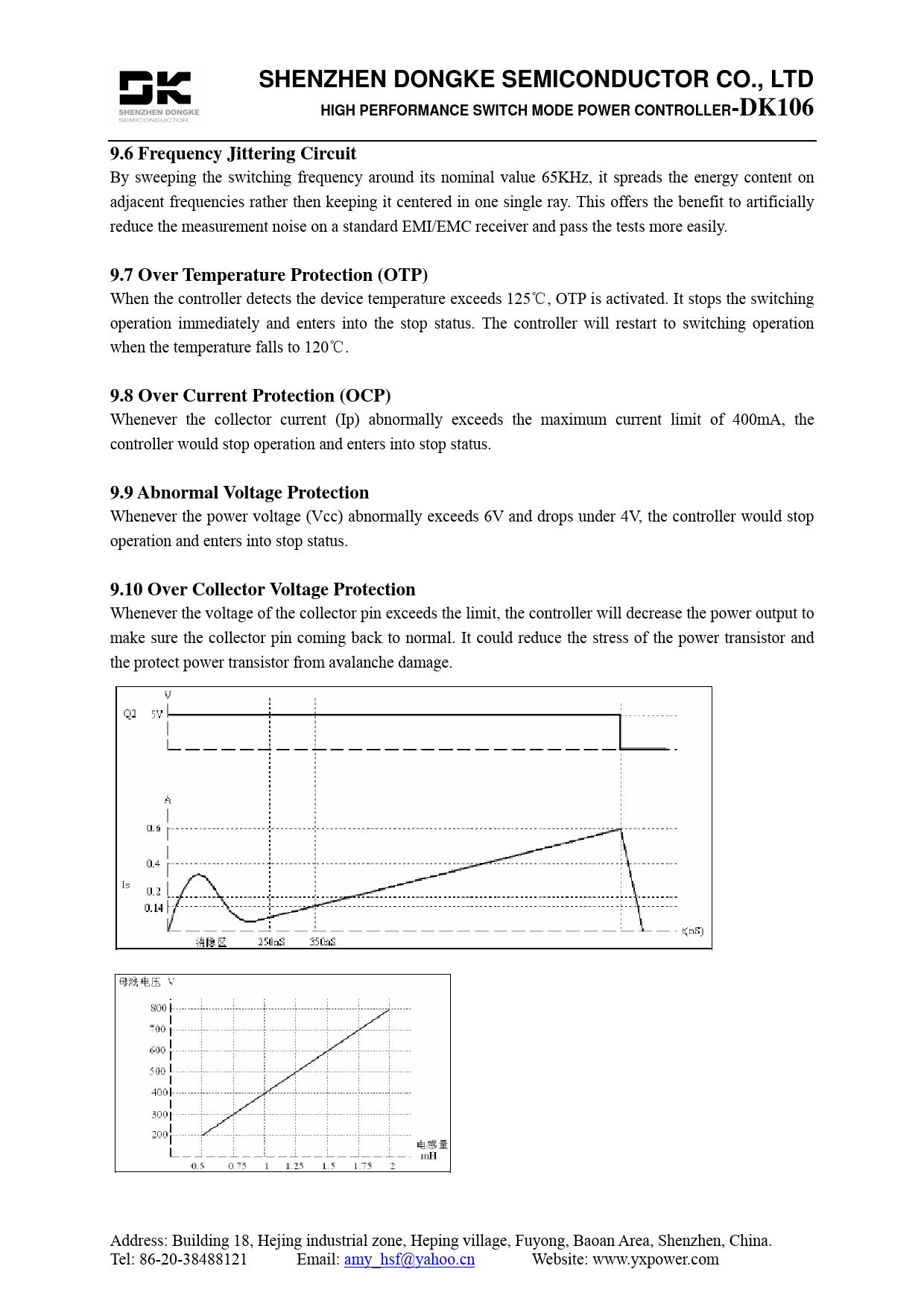 SHENZHEN DONGKE SEMICONDUCTOR CO., LTDHIGH PERFORMANCE SWITCH MODE POWER CONTROLLER-DK1069.6 Frequency Jittering Circuit By sweeping the switching frequency around its nominal value 65KHz, it spreads the energy content on adjacent frequencies rather then keeping it centered in one single ray. This offers the benefit to artificially reduce the measurement noise on a standard EMI/EMC receiver and pass the tests more easily. 9.7 Over Temperature Protection (OTP) When the controller detects the device temperature exceeds 125℃, OTP is activated. It stops the switching operation immediately and enters into the stop status. The controller will restart to switching operation when the temperature falls to 120℃. 9.8 Over Current Protection (OCP) Whenever the collector current (Ip) abnormally exceeds the maximum current limit of 400mA, the controller would stop operation and enters into stop status. 9.9 Abnormal Voltage Protection Whenever the power voltage (Vcc) abnormally exceeds 6V and drops under 4V, the controller would stop operation and enters into stop status. 9.10 Over Collector Voltage Protection Whenever the voltage of the collector pin exceeds the limit, the controller will decrease the power output to make sure the collector pin coming back to normal. It could reduce the stress of the power transistor and the protect power transistor from avalanche damage. Address: Building 18, Hejing industrial zone, Heping village, Fuyong, Baoan Area, Shenzhen, China. Tel: 86-20-38488121 Email: amy_hsf@yahoo.cn Website: www.yxpower.com