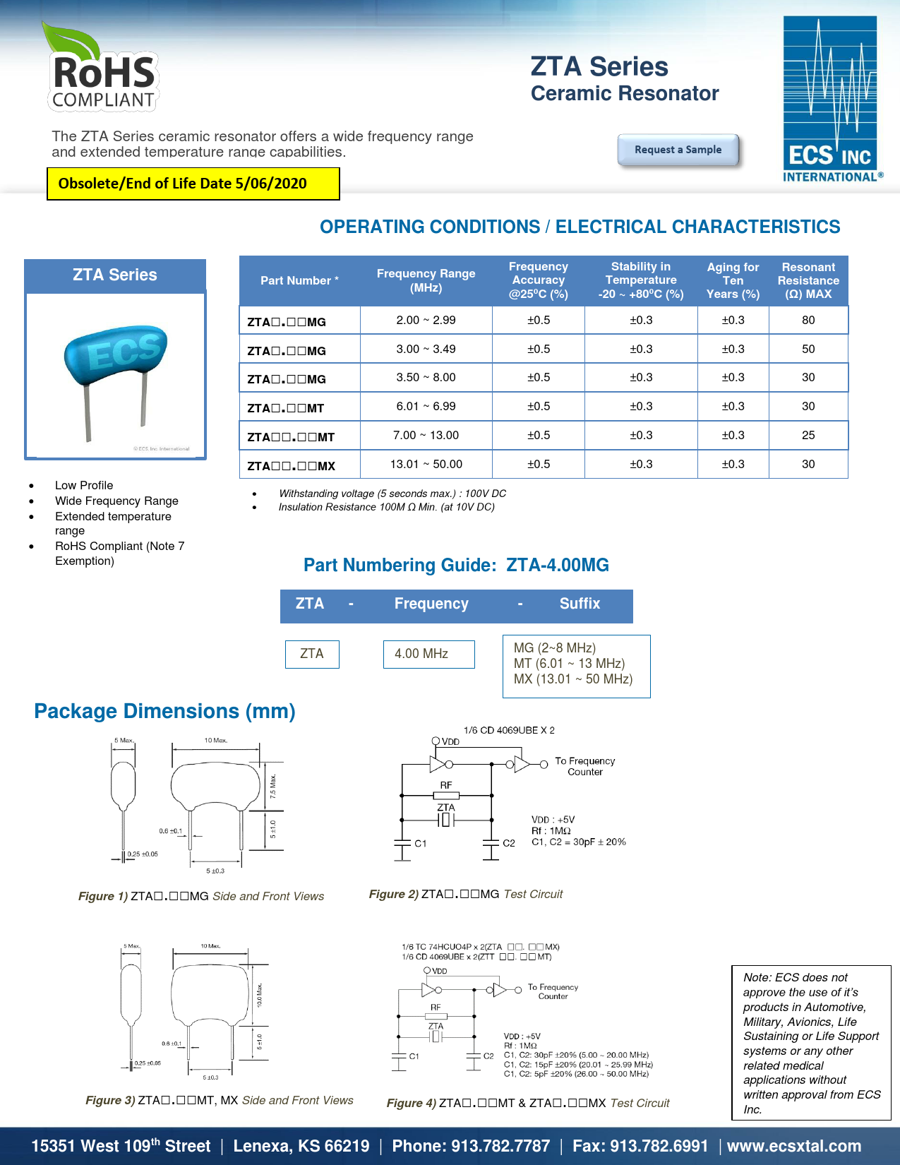 ZTA□.□□MG Test Circuit Note: ECS does not approve the use of it’s products in Automotive, Military, Avionics, Life Sustaining or Life Support systems or any other related medical applications without written approval from ECS