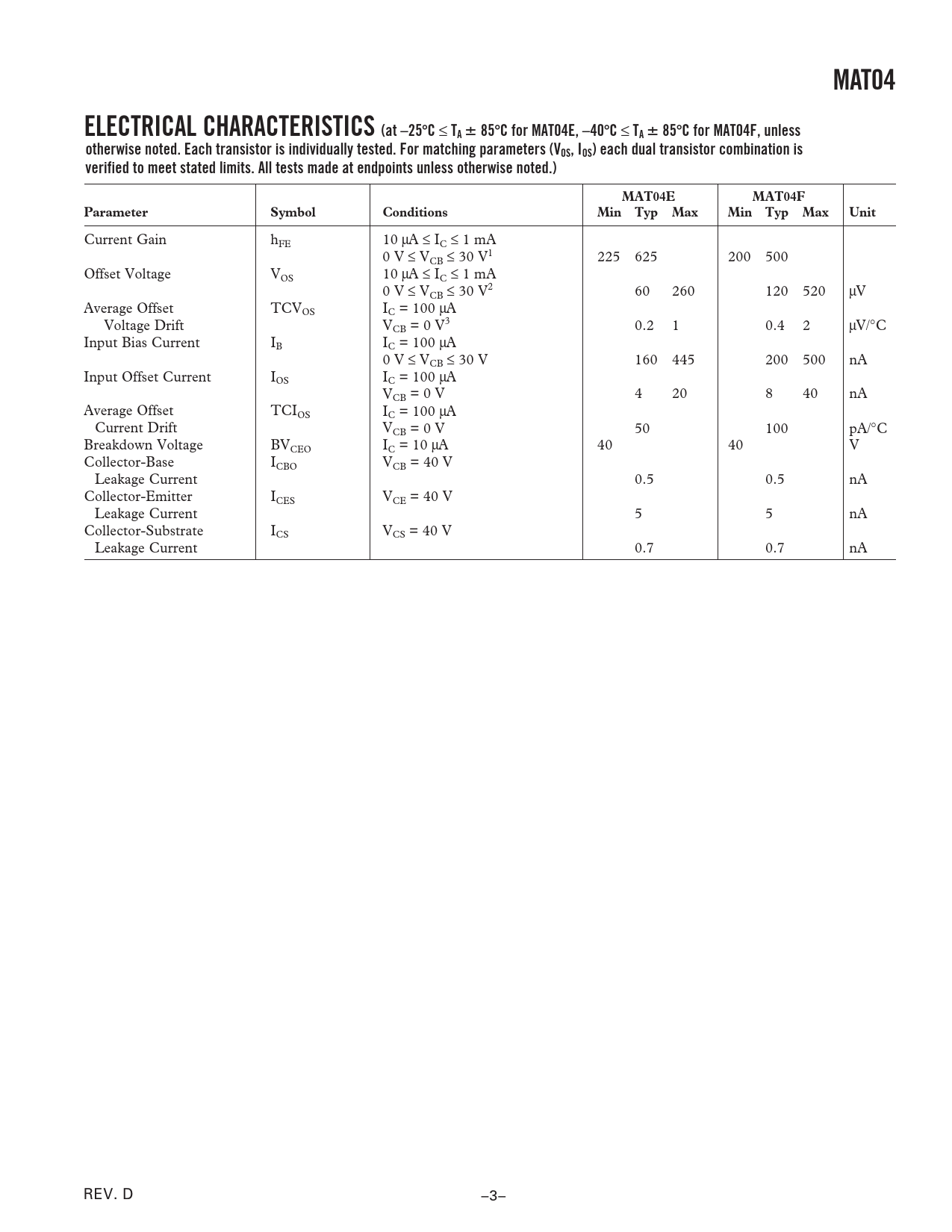 Current Gain hFE 10 µA ≤ IC ≤ 1 mA 0 V ≤ VCB ≤ 30 V1 225 625 200 500 Offset Voltage VOS 10 µA ≤ IC ≤ 1 mA 0 V ≤ VCB ≤ 30 V2 60 260 120 520 µV Average Offset TCVOS IC = 100 µA Voltage Drift VCB = 0 V3 0.2 1 0.4 2 µV/°C Input Bias Current IB IC = 100 µA 0 V ≤ VCB ≤ 30 V 160 445 200 500 nA Input Offset Current IOS IC = 100 µA VCB = 0 V 4 20 8 40 nA Average Offset TCIOS IC = 100 µA Current Drift VCB = 0 V 50 100 pA/°C Breakdown Voltage BVCEO IC = 10 µA 40 40 V Collector-Base ICBO VCB = 40 V Leakage Current 0.5 0.5 nA Collector-Emitter ICES VCE = 40 V Leakage Current 5 5 nA Collector-Substrate ICS VCS = 40 V Leakage Current 0.7 0.7 nA REV. D –3–