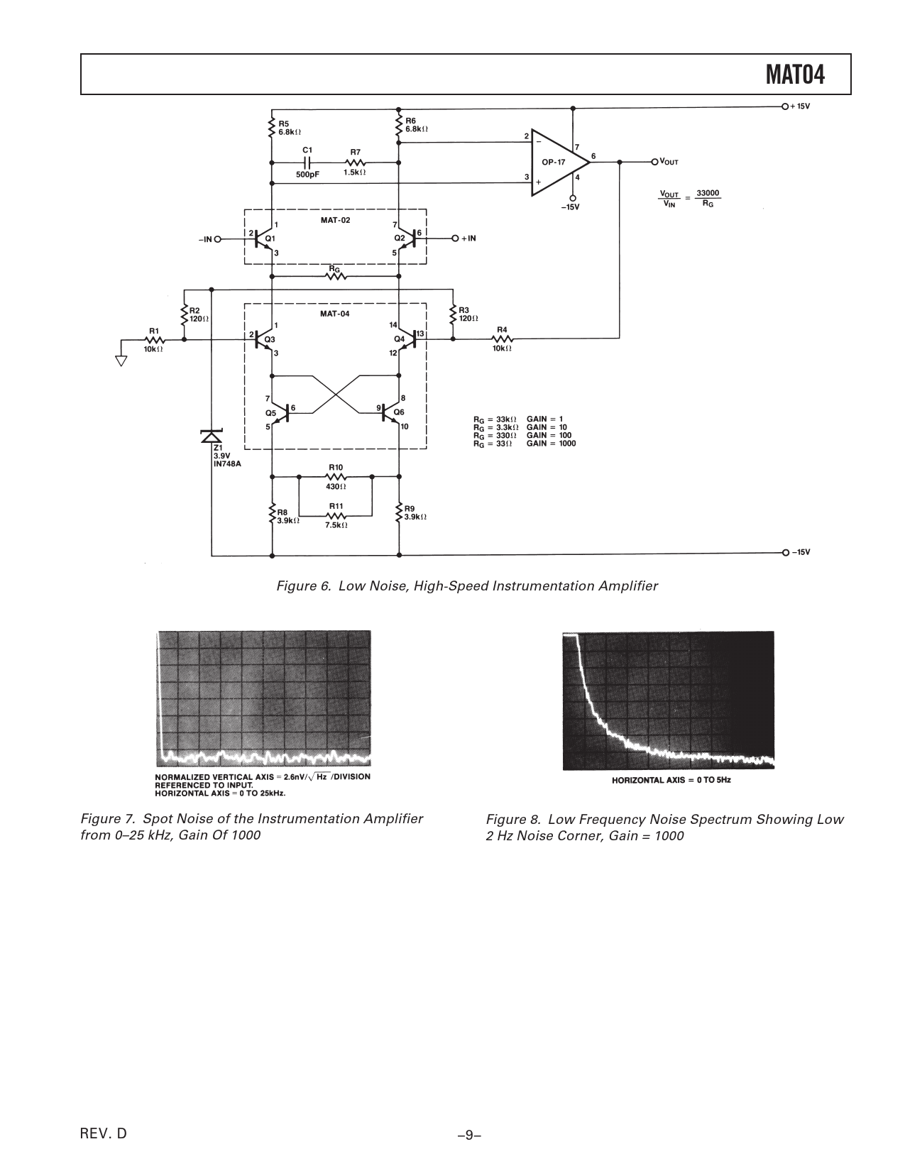 Figure 6. Low Noise, High-Speed Instrumentation Amplifier Figure 7. Spot Noise of the Instrumentation Amplifier Figure 8. Low Frequency Noise Spectrum Showing Low from 0–25 kHz, Gain Of 1000 2 Hz Noise Corner, Gain = 1000 REV. D –9–