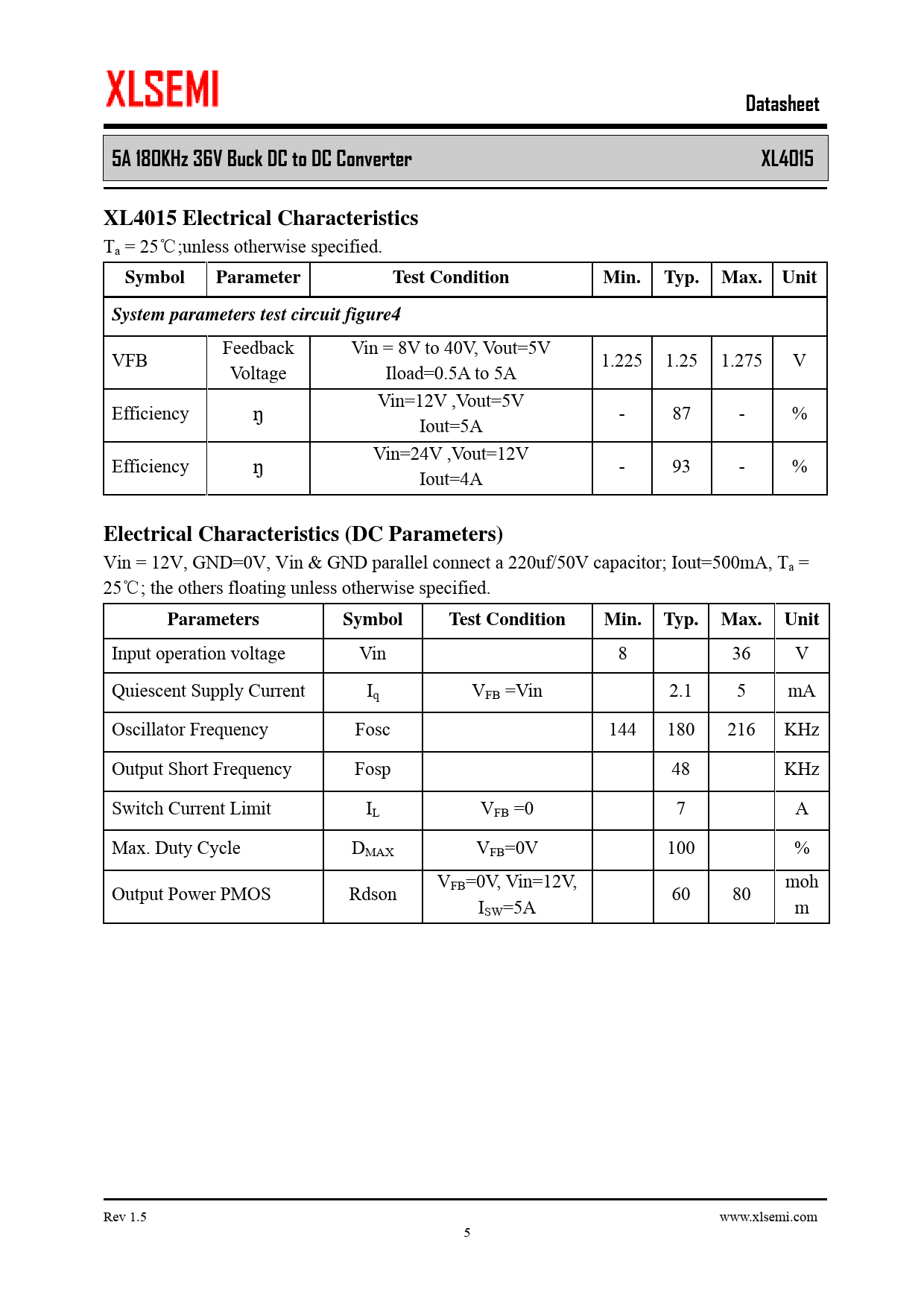 Datasheet. 5A 180KHz 36V Buck DC to DC Converter XL4015. XL4015 Electrical Characteristics. Symbol Parameter. Test. Condition Min