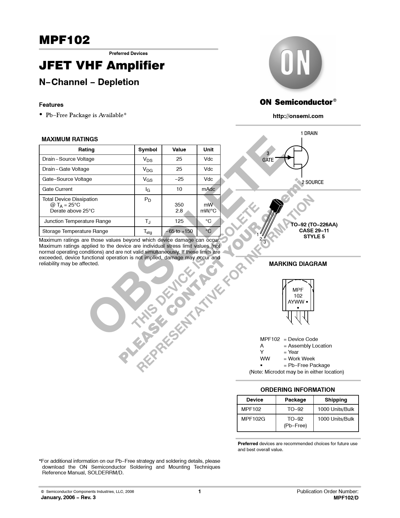 MPF102 TO−92 1000 Units/Bulk MPF102G TO−92 1000 Units/Bulk (Pb−Free)