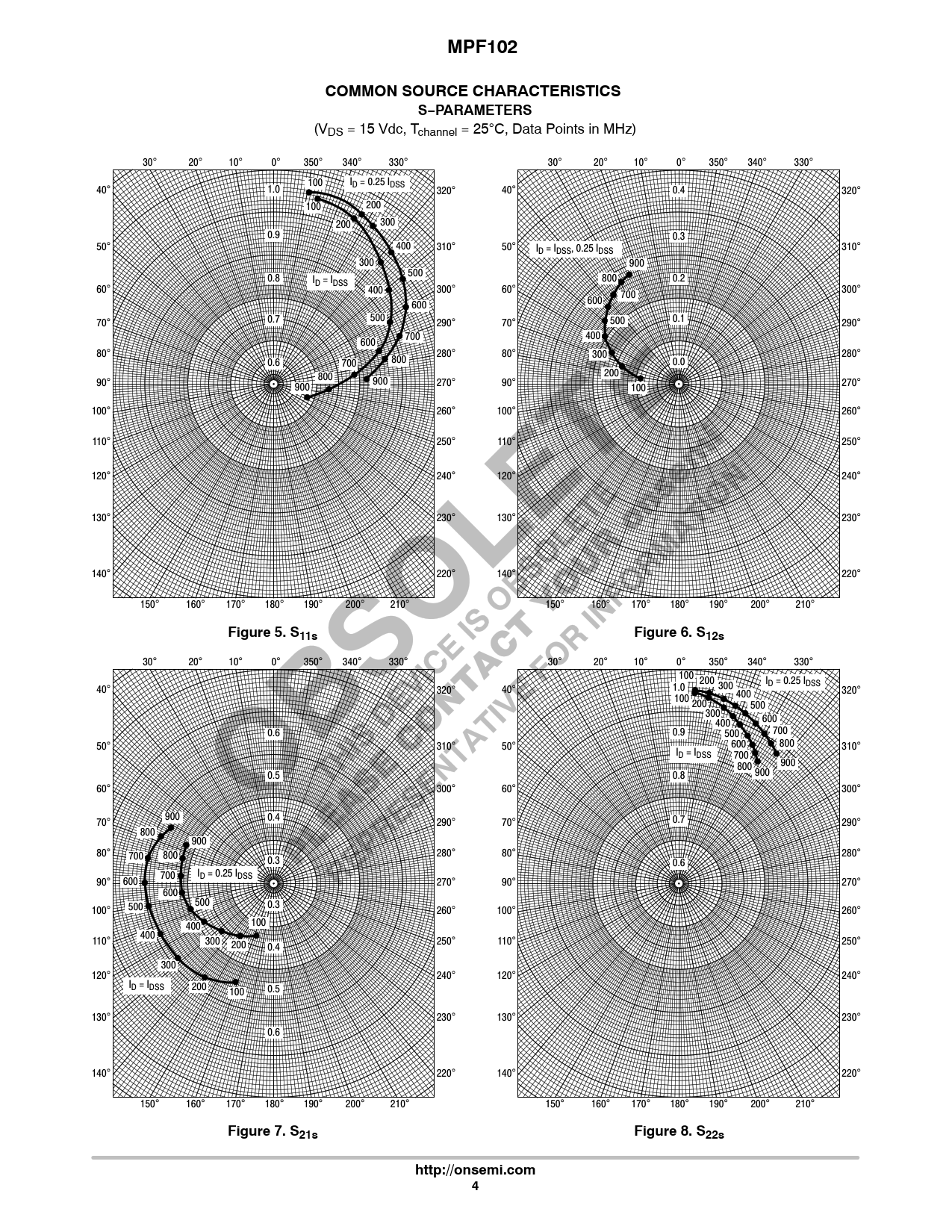 MPF102. COMMON SOURCE CHARACTERISTICS. S−PARAMETERS. Figure 5. S11s. Figure 6. S12s. Figure 7. S21s. Figure 8. S22s