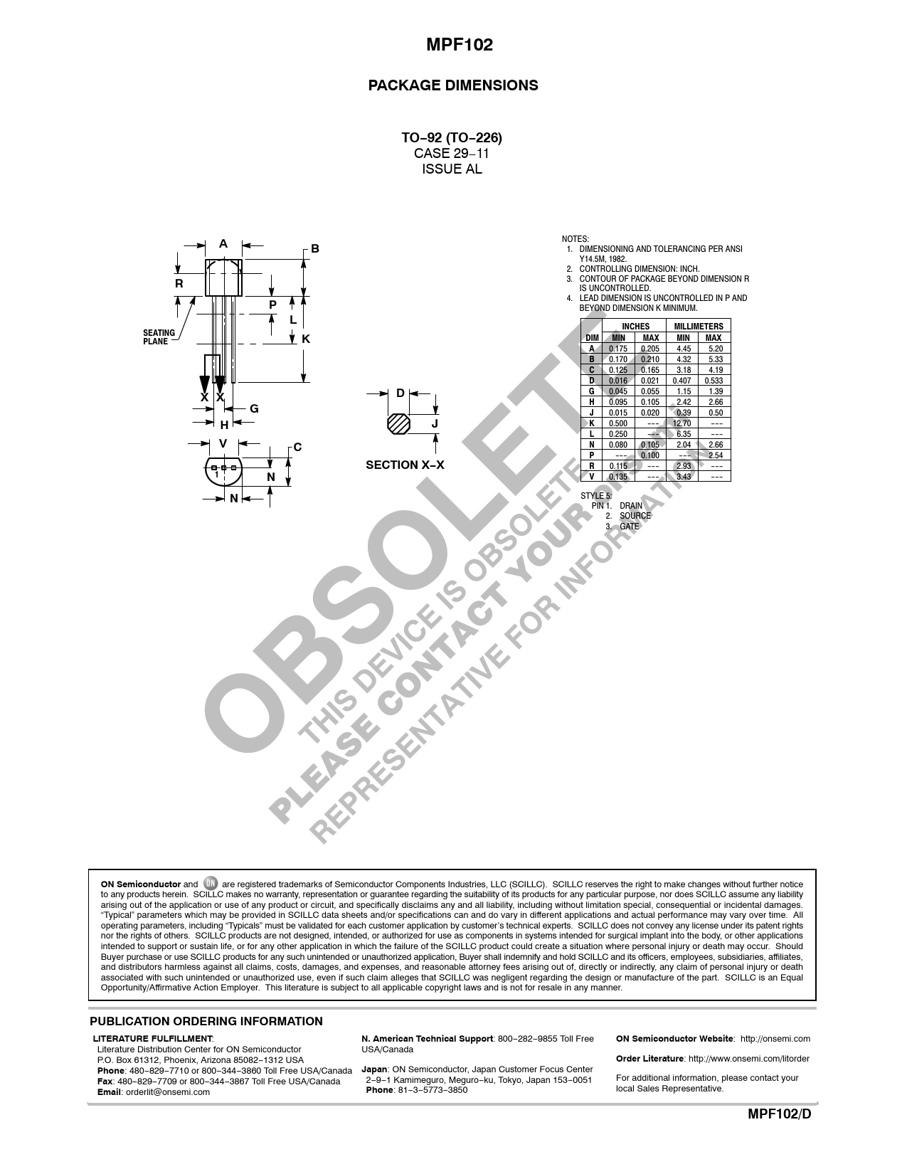 MPF102 PACKAGE DIMENSIONS TO−92 (TO−226) INCHES MILLIMETERS SEATING PLANE DIM MIN MAX X X SECTION X−X ON Semiconductor