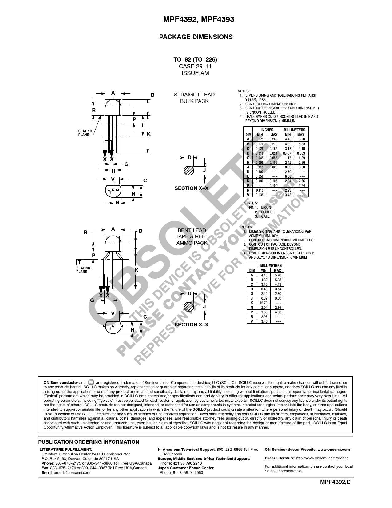 MPF4392, MPF4393PACKAGE DIMENSIONSTO−92 (TO−226) CASE 29−11 ISSUE AM NOTES: AB STRAIGHT LEAD 1. DIMENSIONING AND TOLERANCING PER ANSI Y14.5M, 1982. BULK PACK 2. CONTROLLING DIMENSION: INCH. 3. CONTOUR OF PACKAGE BEYOND DIMENSION R R IS UNCONTROLLED. 4. LEAD DIMENSION IS UNCONTROLLED IN P AND P BEYOND DIMENSION K MINIMUM. LSEATINGINCHESMILLIMETERSPLANEKDIMMINMAXMINMAXA 0.175 0.205 4.45 5.20 B 0.170 0.210 4.32 5.33 C 0.125 0.165 3.18 4.19 D 0.016 0.021 0.407 0.533 DX XG 0.045 0.055 1.15 1.39 GH 0.095 0.105 2.42 2.66 J 0.015 0.020 0.39 0.50 HJK 0.500 --- 12.70 --- VL 0.250 --- 6.35 --- CN 0.080 0.105 2.04 2.66 SECTION X−XP --- 0.100 --- 2.54 R 0.115 --- 2.93 --- 1NV 0.135 --- 3.43 --- N STYLE 5: PIN 1. DRAIN 2. SOURCE 3. GATE NOTES: AB BENT LEAD 1. DIMENSIONING AND TOLERANCING PER R ASME Y14.5M, 1994. TAPE & REEL 2. CONTROLLING DIMENSION: MILLIMETERS. AMMO PACK 3. CONTOUR OF PACKAGE BEYOND DIMENSION R IS UNCONTROLLED. 4. LEAD DIMENSION IS UNCONTROLLED IN P P AND BEYOND DIMENSION K MINIMUM. TMILLIMETERSSEATINGKPLANEDIMMINMAXA 4.45 5.20 B 4.32 5.33 C 3.18 4.19 D 0.40 0.54 DX XG 2.40 2.80 GJ 0.39 0.50 K 12.70 --- JN 2.04 2.66 VP 1.50 4.00 CR 2.93 --- SECTION X−XV 3.43 --- 1NON Semiconductor and are registered trademarks of Semiconductor Components Industries, LLC (SCILLC). SCILLC reserves the right to make changes without further notice to any products herein. SCILLC makes no warranty, representation or guarantee regarding the suitability of its products for any particular purpose, nor does SCILLC assume any liability arising out of the application or use of any product or circuit, and specifically disclaims any and all liability, including without limitation special, consequential or incidental damages. “Typical” parameters which may be provided in SCILLC data sheets and/or specifications can and do vary in different applications and actual performance may vary over time. All operating parameters, including “Typicals” must be validated for each customer application by customer’s technical experts. SCILLC does not convey any license under its patent rights nor the rights of others. SCILLC products are not designed, intended, or authorized for use as components in systems intended for surgical implant into the body, or other applications intended to support or sustain life, or for any other application in which the failure of the SCILLC product could create a situation where personal injury or death may occur. Should Buyer purchase or use SCILLC products for any such unintended or unauthorized application, Buyer shall indemnify and hold SCILLC and its officers, employees, subsidiaries, affiliates, and distributors harmless against all claims, costs, damages, and expenses, and reasonable attorney fees arising out of, directly or indirectly, any claim of personal injury or death associated with such unintended or unauthorized use, even if such claim alleges that SCILLC was negligent regarding the design or manufacture of the part. SCILLC is an Equal Opportunity/Affirmative Action Employer. This literature is subject to all applicable copyright laws and is not for resale in any manner. PUBLICATION ORDERING INFORMATIONLITERATURE FULFILLMENT : N. American Technical Support : 800−282−9855 Toll Free ON Semiconductor Website : www.onsemi.com Literature Distribution Center for ON Semiconductor USA/Canada P.O. Box 5163, Denver, Colorado 80217 USA Europe, Middle East and Africa Technical Support:Order Literature : http://www.onsemi.com/orderlit Phone : 303−675−2175 or 800−344−3860 Toll Free USA/Canada Phone: 421 33 790 2910 Fax : 303−675−2176 or 800−344−3867 Toll Free USA/Canada Japan Customer Focus Center For additional information, please contact your local Email : orderlit@onsemi.com Phone: 81−3−5817−1050 Sales Representative http://onsemi.comMPF4392/D6