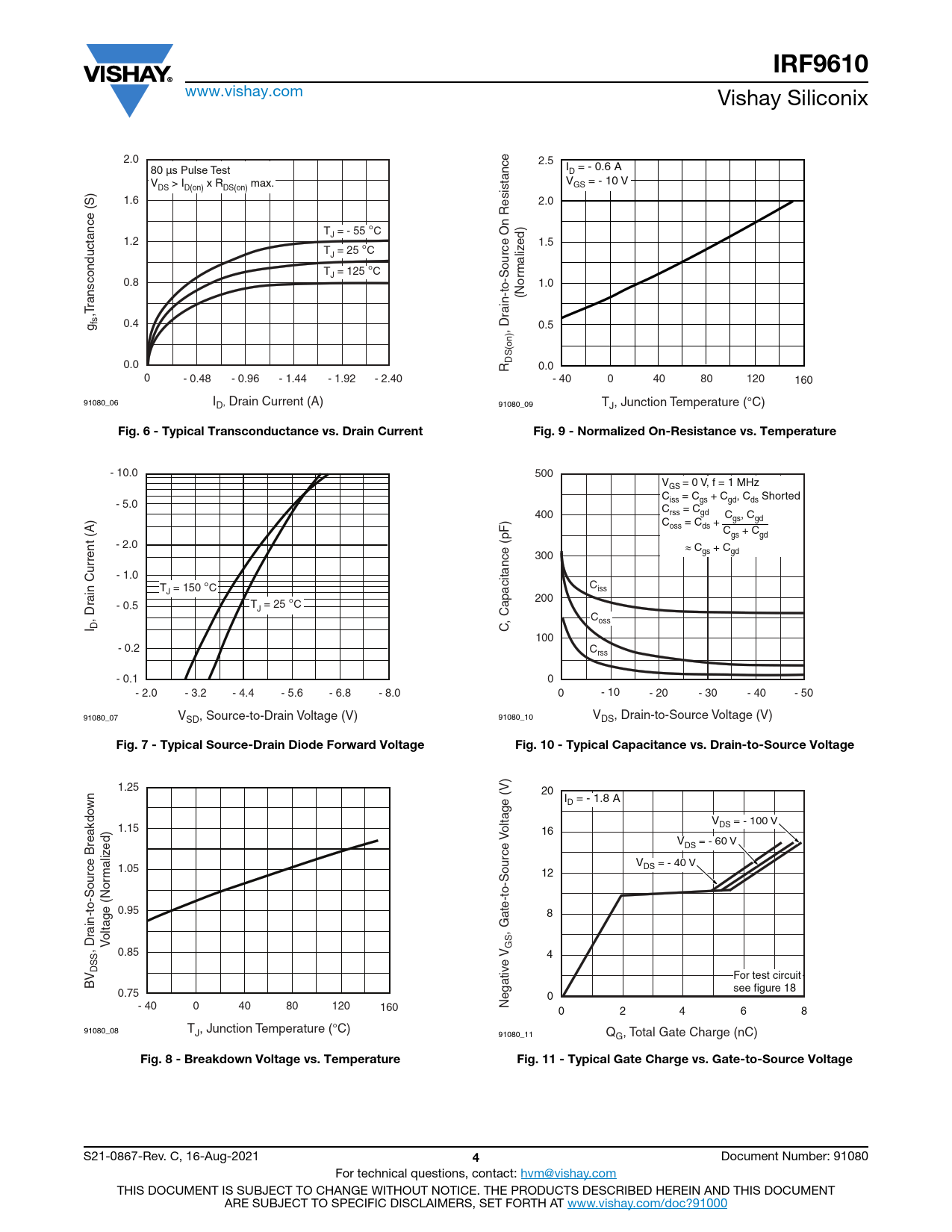 IRF9610 www.vishay.com Vishay Siliconix 2.0 2.5 80 µs Pulse Test I = - 0.6 A D V > I x R max. V = - 10 V DS D(on) DS(on) GS 1.6 2.0 T = - 55 °C J 1.2 ed) 1.5 T = 25 °C J T = 125 °C maliz J 0.8 1.0 (Nor ransconductance (S) ,T ain-to-Source On Resistance fsg 0.4 , Dr 0.5 DS(on) 0.0 R 0.0 0 - 0.48 - 0.96 - 1.44 - 1.92 - 2.40 - 40 0 40 80 120 160 91080_06 ID, Drain Current (A) 91080_09 TJ, Junction Temperature (°C) Fig. 6 - Typical Transconductance vs. Drain CurrentFig. 9 - Normalized On-Resistance vs. Temperature - 10.0 500 VGS = 0 V, f = 1 MHz C = C + C , C Shorted - 5.0 iss gs gd ds C = C 400 rss gd C , C C = C + gs gd oss ds C + C gs gd - 2.0 ≈ C + C 300 gs gd - 1.0 T = 150 °C C J iss ain Current (A) 200 - 0.5 T = 25 °C J , Dr , Capacitance (pF) Coss I D C 100 - 0.2 Crss - 0.1 0 - 2.0 - 3.2 - 4.4 - 5.6 - 6.8 - 8.0 0 - 10 - 20 - 30 - 40 - 50 91080_07 VSD, Source-to-Drain Voltage (V) 91080_10 VDS, Drain-to-Source Voltage (V) Fig. 7 - Typical Source-Drain Diode Forward VoltageFig. 10 - Typical Capacitance vs. Drain-to-Source Voltage 1.25 20 I = - 1.8 A wn D ltage (V) V = - 100 V 1.15 o DS V 16 ed) V = - 60 V DS V = - 40 V DS maliz 1.05 12 0.95 8 ain-to-Source Breakdo ltage (Nor o , Gate-to-Source , Dr V GS 0.85 4 e V DSS For test circuit BV 0.75 see figure 18 0 - 40 0 40 80 120 160 Negativ 0 2 4 6 8 91080_08 TJ, Junction Temperature (°C) 91080_11 QG, Total Gate Charge (nC) Fig. 8 - Breakdown Voltage vs. TemperatureFig. 11 - Typical Gate Charge vs. Gate-to-Source Voltage S21-0867-Rev. C, 16-Aug-2021 4 Document Number: 91080 For technical questions, contact: hvm@vishay.com THIS DOCUMENT IS SUBJECT TO CHANGE WITHOUT NOTICE. THE PRODUCTS DESCRIBED HEREIN AND THIS DOCUMENT ARE SUBJECT TO SPECIFIC DISCLAIMERS, SET FORTH AT www.vishay.com/doc?91000