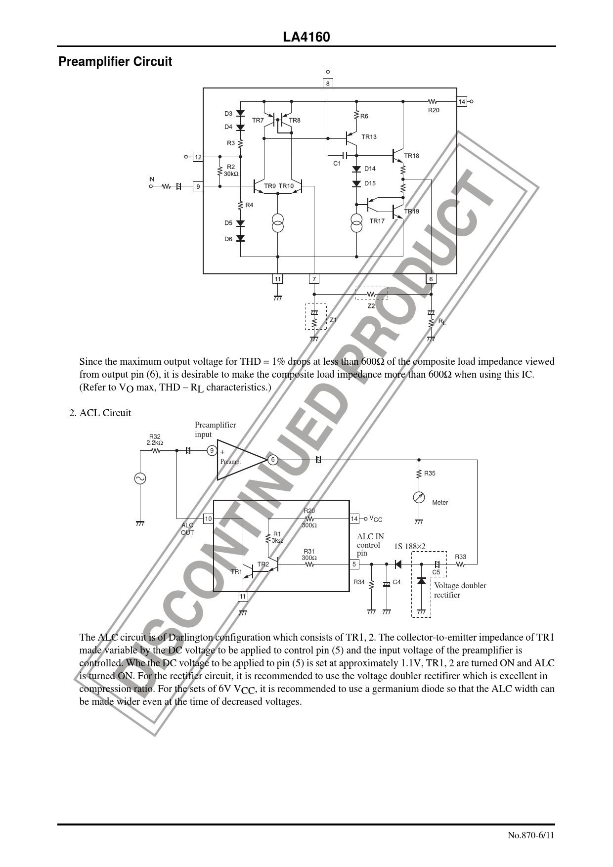 LA4160 Preamplifier Circuit Since the maximum output voltage for THD = 1% drops at less than 600Ω of the composite load impedance viewed from output pin (6), it is desirable to make the composite load impedance more than 600Ω when using this IC. (Refer to VO max, THD – RL characteristics.) 2. ACL Circuit Preamplifier input R32 2.2kΩ 9 + 6 Preamp. R35 Meter R20 10 14 300Ω ALC OUT R1 3kΩ ALC IN control pin R31 300Ω TR2 VCC 1S 188×2 R33 5 TR1 C5 R34 11 C4 Voltage doubler rectifier The ALC circuit is of Darlington configuration which consists of TR1, 2. The collector-to-emitter impedance of TR1 made variable by the DC voltage to be applied to control pin (5) and the input voltage of the preamplifier is controlled. Whe the DC voltage to be applied to pin (5) is set at approximately 1.1V, TR1, 2 are turned ON and ALC is turned ON. For the rectifier circuit, it is recommended to use the voltage doubler rectifirer which is excellent in compression ratio. For the sets of 6V VCC, it is recommended to use a germanium diode so that the ALC width can be made wider even at the time of decreased voltages. No.870-6/11
