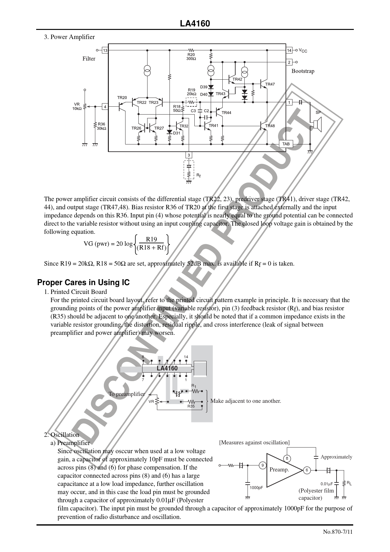 LA4160 3. Power Amplifier The power amplifier circuit consists of the differential stage (TR22, 23), predriver stage (TR41), driver stage (TR42, 44), and output stage (TR47,48). Bias resistor R36 of TR20 at the first stage is attached externally and the input impedance depends on this R36. Input pin (4) whose potential is nearly equal to the ground potential can be connected direct to the variable resistor without using an input coupling capacitor. The closed loop voltage gain is obtained by the following equation. R19 VG (pwr) = 20 log ( R18 + Rf ) Since R19 = 20kΩ, R18 = 50Ω are set, approximately 52dB max. is available if Rf = 0 is taken. Proper Cares in Using IC 1. Printed Circuit Board For the printed circuit board layout, refer to the printed circuit pattern example in principle. It is necessary that the grounding points of the power amplifier input (variable resistor), pin (3) feedback resistor (Rf), and bias resistor (R35) should be adjacent to one another. Especially, it should be noted that if a common impedance exists in the variable resistor grounding, the distortion, residual ripple, and cross interference (leak of signal between preamplifier and power amplifier) may worsen. 8 14 LA4160 7 1 R1 To preamplifier Make adjacent to one another. VR R35 2. Oscillation [Measures against oscillation] a) Preamplifier Since oscillation may osccur when used at a low voltage Approximately 8 gain, a capacitor of approximately 10pF must be connected 9 across pins (8) and (6) for phase compensation. If the 6 Preamp. capacitor connected across pins (8) and (6) has a large RL 0.01μF capacitance at a low load impedance, further oscillation 1000pF (Polyester film may occur, and in this case the load pin must be grounded capacitor) through a capacitor of approximately 0.01μF (Polyester film capacitor). The input pin must be grounded through a capacitor of approximately 1000pF for the purpose of prevention of radio disturbance and oscillation. No.870-7/11