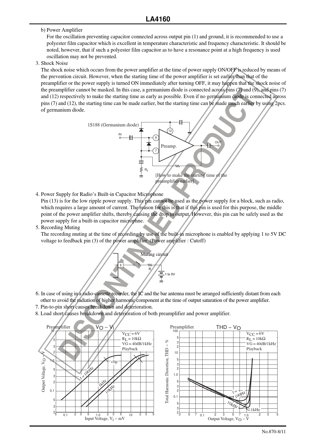 LA4160 b) Power Amplifier For the oscillation preventing capacitor connected across output pin (1) and ground, it is recommended to use a polyester film capacitor which is excellent in temperature characteristic and frequency characteristic. It should be noted, however, that if such a polyester film capacitor as to have a resonance point at a high frequency is used oscillation may not be prevented. 3. Shock Noise The shock noise which occurs from the power amplifier at the time of power supply ON/OFF is reduced by means of the prevention circuit. However, when the starting time of the power amplifier is set earlier than that of the preamplifier or the power supply is turned ON immediately after turning OFF, it may happen that the shock noise of the preamplifier cannot be masked. In this case, a germanium diode is connected across pins (7) and (9), and pins (7) and (12) respectively to make the starting time as early as possible. Even if no germanium diode is connected across pins (7) and (12), the starting time can be made earlier, but the starting time can be made much earlier by using 2pcs. of germanium diode. 1S188 (Germanium diode) 12 IN 9 OUT Preamp. 7 Rf [How to make the starting time of the preamplifier earlier] 4. Power Supply for Radio’s Built-in Capacitor Microphone Pin (13) is for the low ripple power supply. This pin cannot be used as the power supply for a block, such as radio, which requires a large amount of current. The reason for this is that if this pin is used for this purpose, the middle point of the power amplifier shifts, thereby causing the drop in output. However, this pin can be safely used as the power supply for a built-in capacitor microphne. 5. Recording Muting The recording muting at the time of recording by use of the built-in microphone is enabled by applying 1 to 5V DC voltage to feedback pin (3) of the power amplifier. (Power amplifier : Cutoff) 6. In case of using in a radio-cassette recorder, the IC and the bar antenna must be arranged sufficiently distant from each other to avoid the radiation of higher harmonic component at the time of output saturation of the power amplifier. 7. Pin-to-pin short causes breakdown and deterioration. 8. Load short causes breakdown and deterioration of both preamplifier and power amplifier. VO -Vi Preamplifier 10 3 Output Voltage, VO -V 100 2 Total Harmonic Distortion, THD -% 5 1.0 clip z 5 0H 3 f= 10 Hz 2 1k Hz k 0.1 10 5 3 2 5 0.1 2 3 5 1.0 2 3 THD -VO Preamplifier VCC = 6V RL = 10kΩ VG = 40dB/1kHz Playback 5 Input Voltage, Vi -mV 10 2 3 5 VCC = 6V RL = 10kΩ VG = 40dB/1kHz Playback 5 3 2 10 5 3 2 1.0 5 3 2 f = Hz 100 0.1 5 3 2 10k Hz 3 5 7 0.1 2 3 5 1kHz 7 1.0 2 3 5 Output Voltage, VO -V No.870-8/11