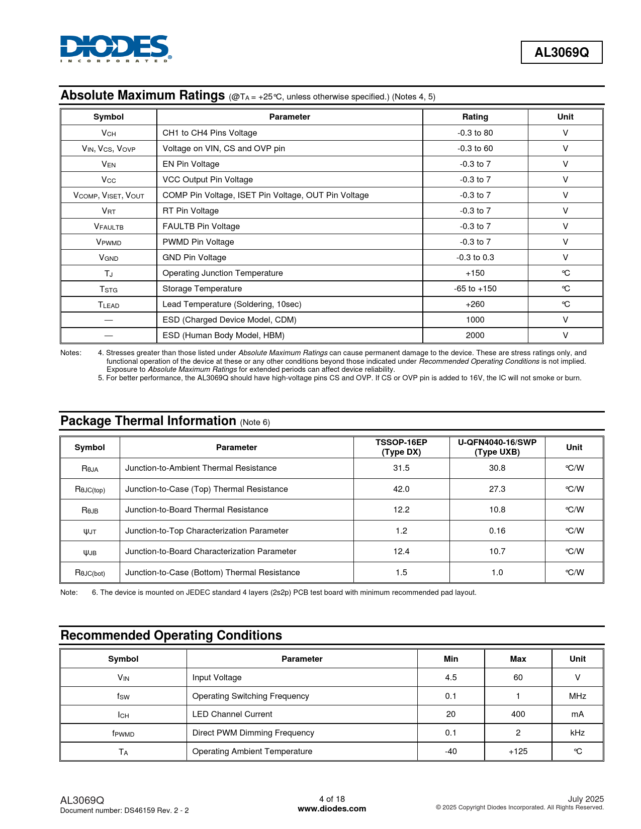 AL3069Q. Absolute Maximum Ratings. Symbol. Parameter. Rating. Unit. Package Thermal Information. TSSOP-16EP. U-QFN4040-16/SWP. (Type DX)