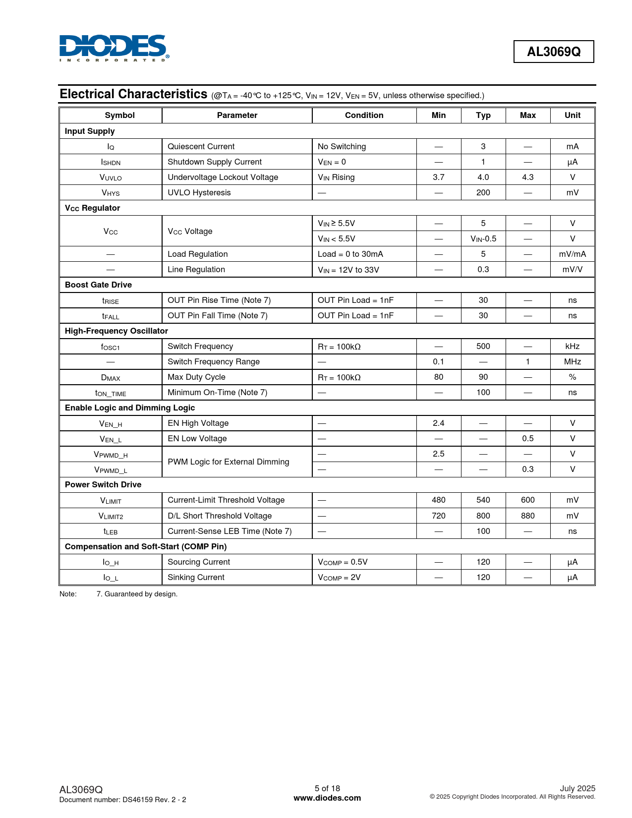 IO_H Sourcing Current VCOMP = 0.5V — 120 — µA IO_L Sinking Current VCOMP = 2V — 120 — µA Note: 7. Guaranteed by design. AL3069Q 5 of 18 July 2025 Document number: DS46159 Rev. 2 - 2