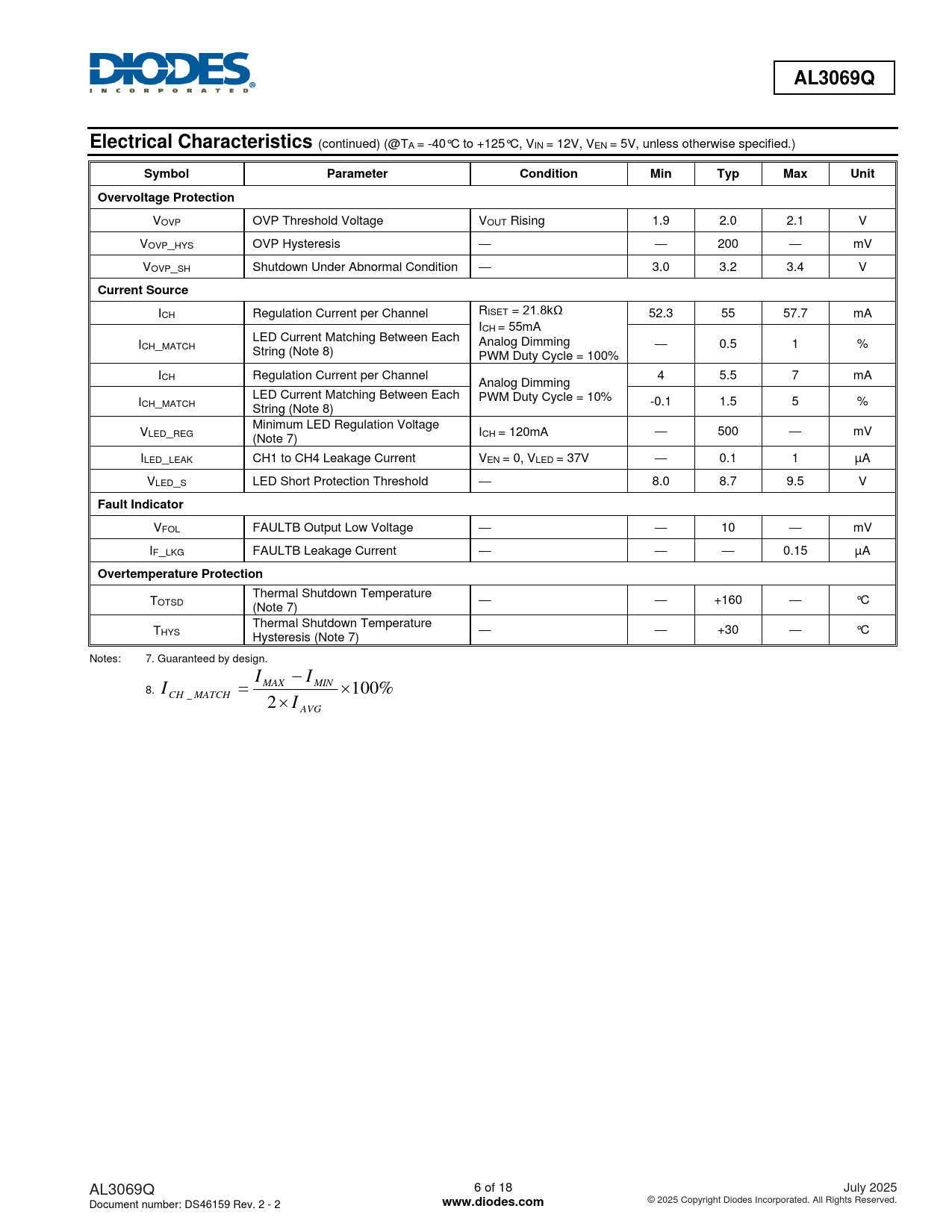 Thermal Shutdown Temperature TOTSD — — +160 — °C (Note 7) Thermal Shutdown Temperature THYS — — +30 — °C Hysteresis (Note 7) Notes: 7. Guaranteed by design. I − I MAX MIN 8. I = % 100 CH _ MATCH 2 I AVG AL3069Q 6 of 18 July 2025 Document number: DS46159 Rev. 2 - 2