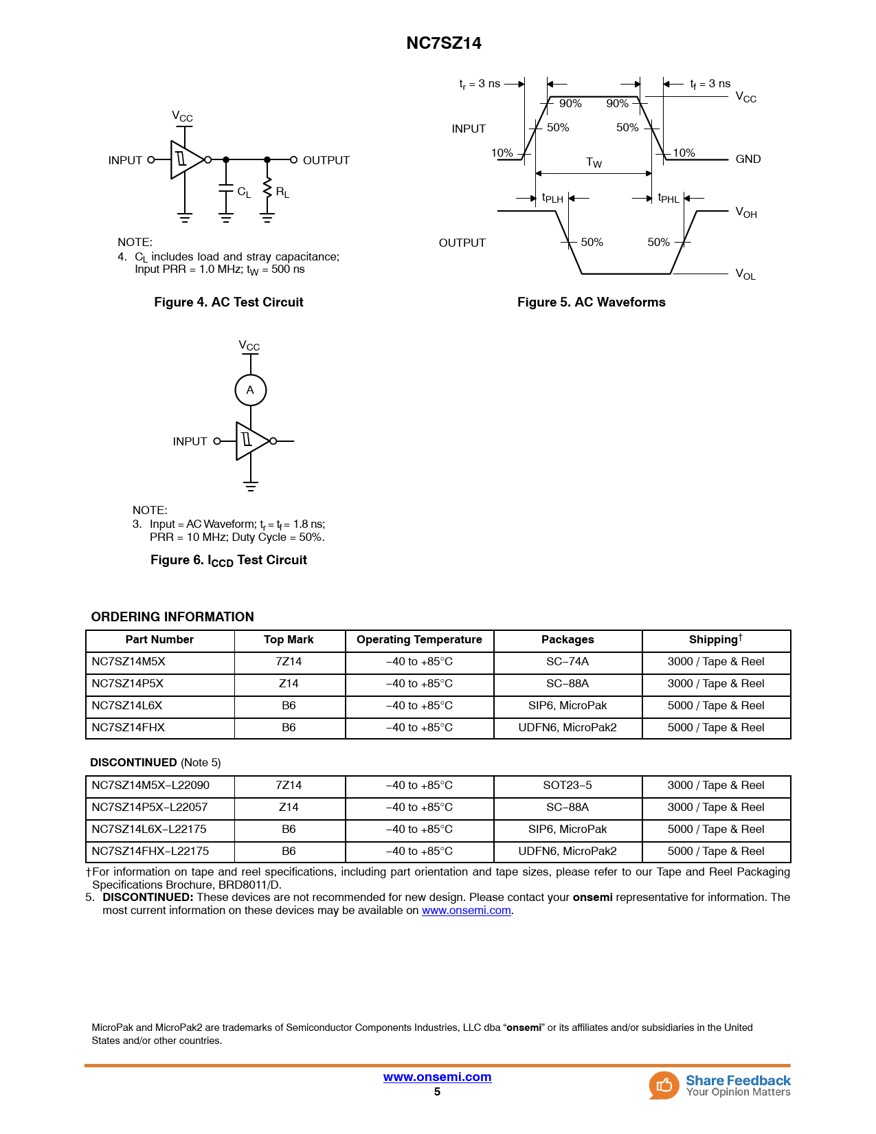 NC7SZ14. Figure 4. AC Test Circuit. Figure 5. AC Waveforms. Figure 6. ICCD Test Circuit. ORDERING INFORMATION. Part Number